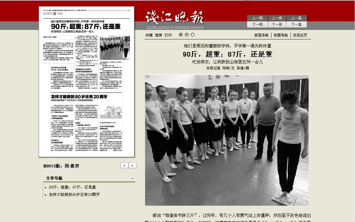 昨天,钱报记者“不幸”旁观了浙江艺术职业学院(没错就是周迅和董卿的母校)舞蹈系的开学第一课。你知道她们在干什么?称体重,这是必修课。如果比寒假前重了的同学,对不起,请自觉到操场跑10圈!