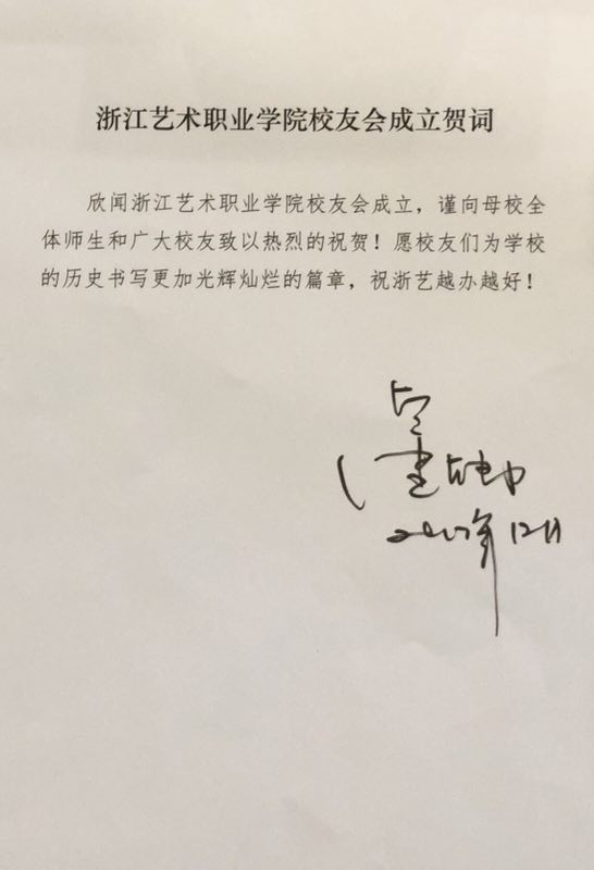 浙艺校友周迅、董卿发来贺信。在信息化时代,周迅选择了亲笔书写这样一种温馨的方式送上对母校的祝福。她说“敬爱的母校要成立校友会了,在此衷心祝贺。我1989年进入省艺校,就读于89社舞班,毕业于1992年。现在学校虽然已经搬了,但我对黄龙洞的校园有着深刻的记忆:我们的排练厅、住的小红楼,满校的桂花香,每天早上的早课、训练,虽然严格,但和老师同学们都过得非常开心。回忆里都是美好的日子。”董卿在贺信中说,欣闻浙江艺术职业学院校友会成立,谨向母校全体师生和广大校友致以热烈的祝贺!愿校友们为学校的历史书写更加光辉灿烂的篇章,祝浙艺越办越好!