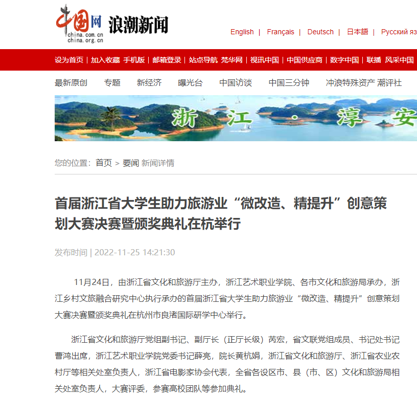 11月24日,由浙江省文化和旅游厅主办,浙江艺术职业学院、各市文化和旅游局承办,浙江乡村文旅融合研究中心执行承办的首届浙江省大学生助力旅游业“微改造、精提升”创意策划大赛决赛暨颁奖典礼在杭州市良渚国际研学中心举行。