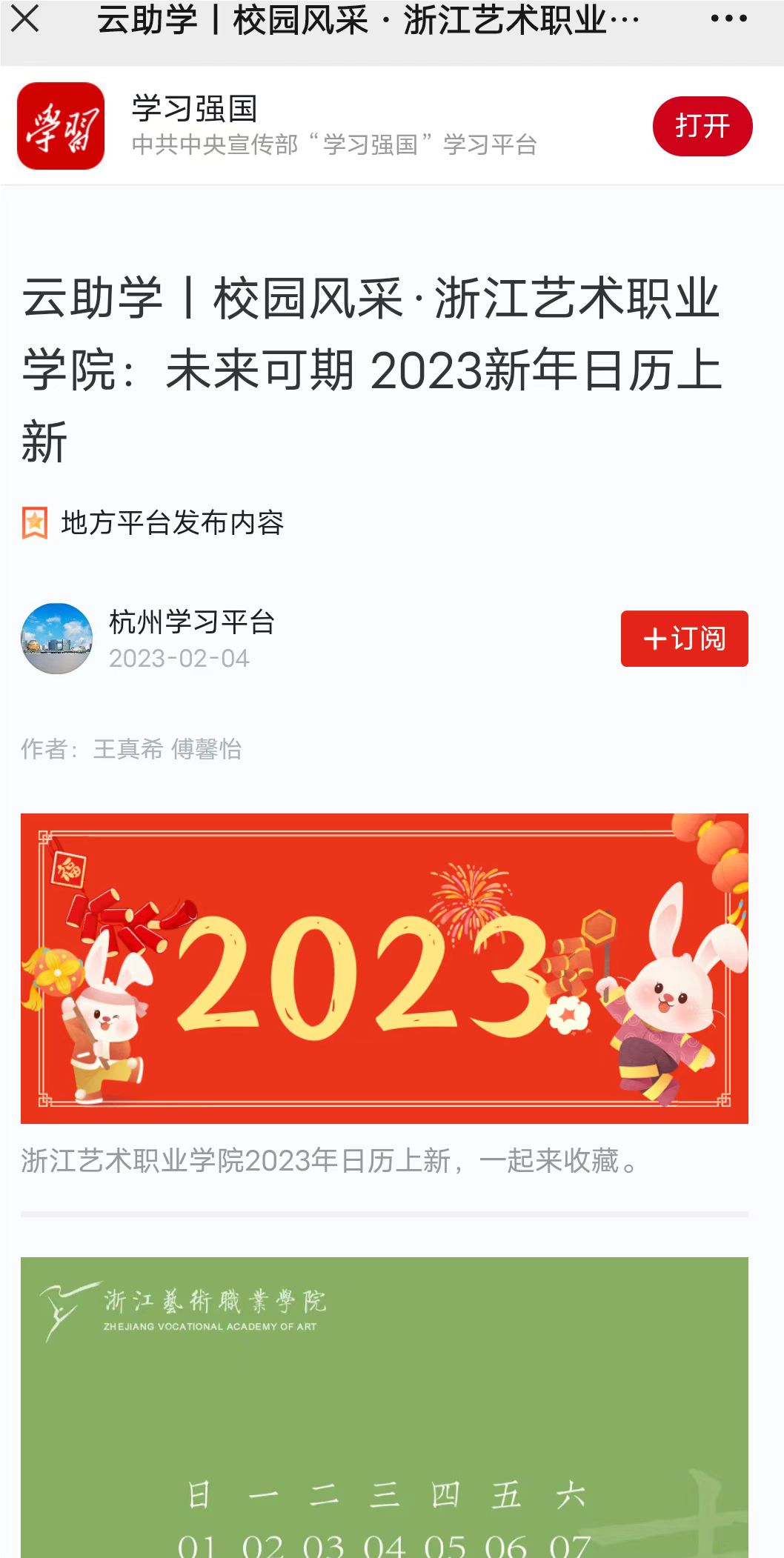 学习强国杭州平台:云助学丨校园风采·浙江艺术职业学院:未来可期 2023新年日历上新