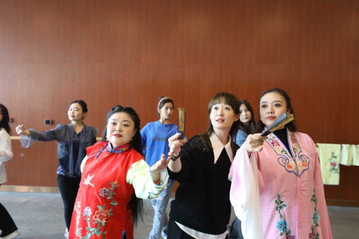 浙江艺术职业学院戏曲学院昆剧教师耿绿洁(前排左二黑衣)正在进行昆剧教学