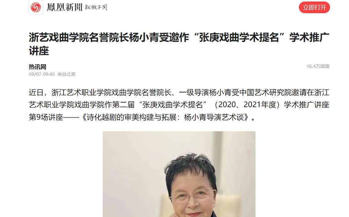 近日,浙江艺术职业学院戏曲学院名誉院长、一级导演杨小青受中国艺术研究院邀请在浙江艺术职业学院戏曲学院作第二届“张庚戏曲学术提名”(2020、2021年度)学术推广讲座第9场讲座——《诗化越剧的审美构建与拓展:杨小青导演艺术谈》。