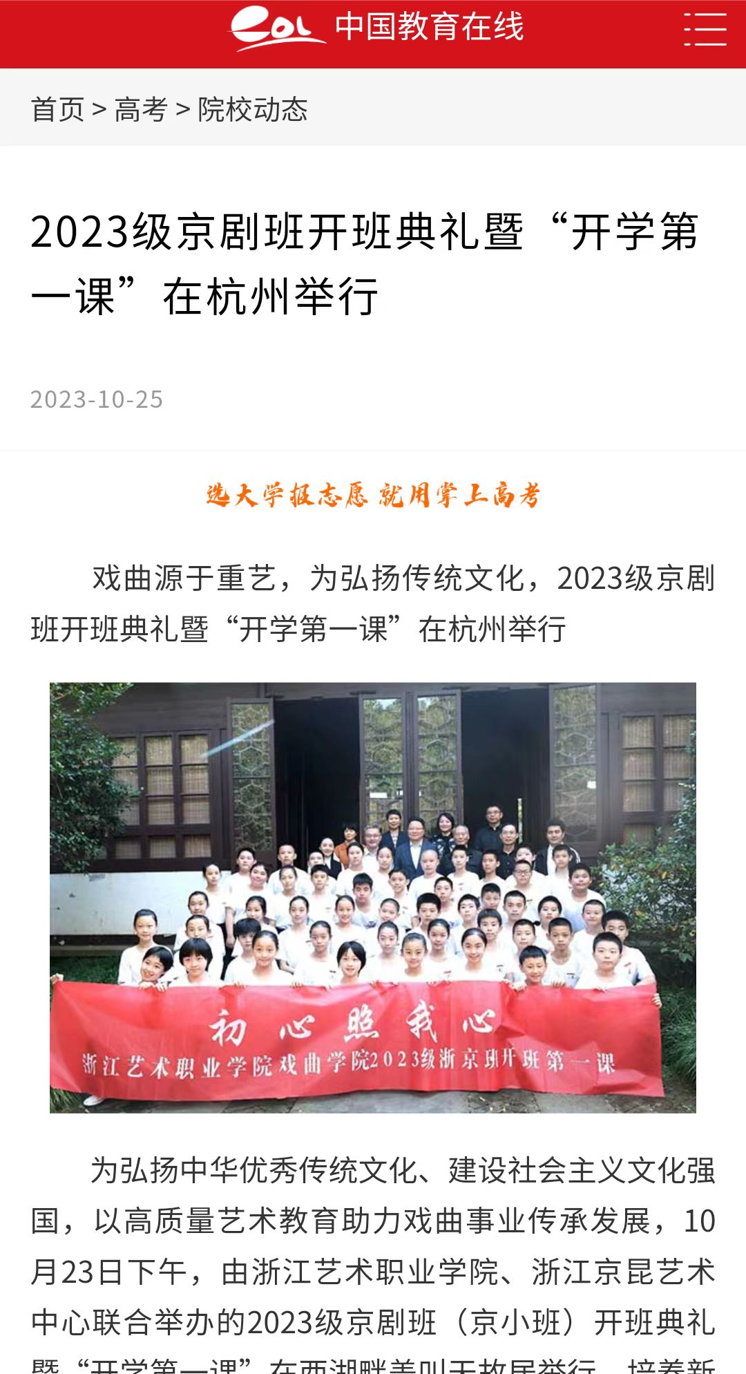 为弘扬中华优秀传统文化、建设社会主义文化强国,以高质量艺术教育助力戏曲事业传承发展,10月23日下午,由浙江艺术职业学院、浙江京昆艺术中心联合举办的2023级京剧班(京小班)开班典礼暨“开学第一课”在西湖畔盖叫天故居举行。培养新一代的京剧表演艺术接班人,是京剧人不可忽视、不容推卸的历史责任,这是浙江时隔31年再度开办京剧表演艺术专业订单班。50名小小京剧人行拜师礼、接练功带,以奋进之姿赓续浙江京剧薪火。