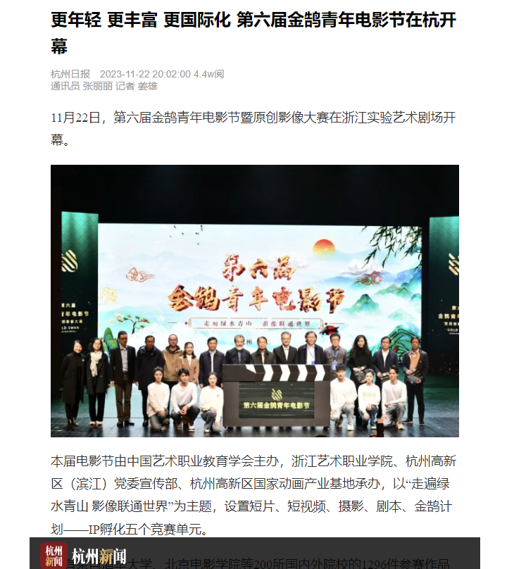 杭州日报:更年轻 更丰富 更国际化 第六届金鹄青年电影节在杭开幕