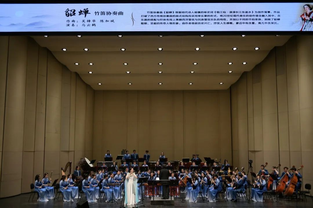 伴随着气势恢宏的民族管弦乐《貂蝉》的奏响,音乐会拉开了帷幕。随后,笛子协奏曲《长生殿·写意》《西施》《王昭君》一一演奏,为观众带来听觉盛宴。晚会最后,赵松庭先生的嫡传弟子吴樟华,携手王华、马云鹤、熊箫涵为观众献上一曲笛子齐奏《幽兰逢春》,用笛声缅怀恩师的栽培之恩。