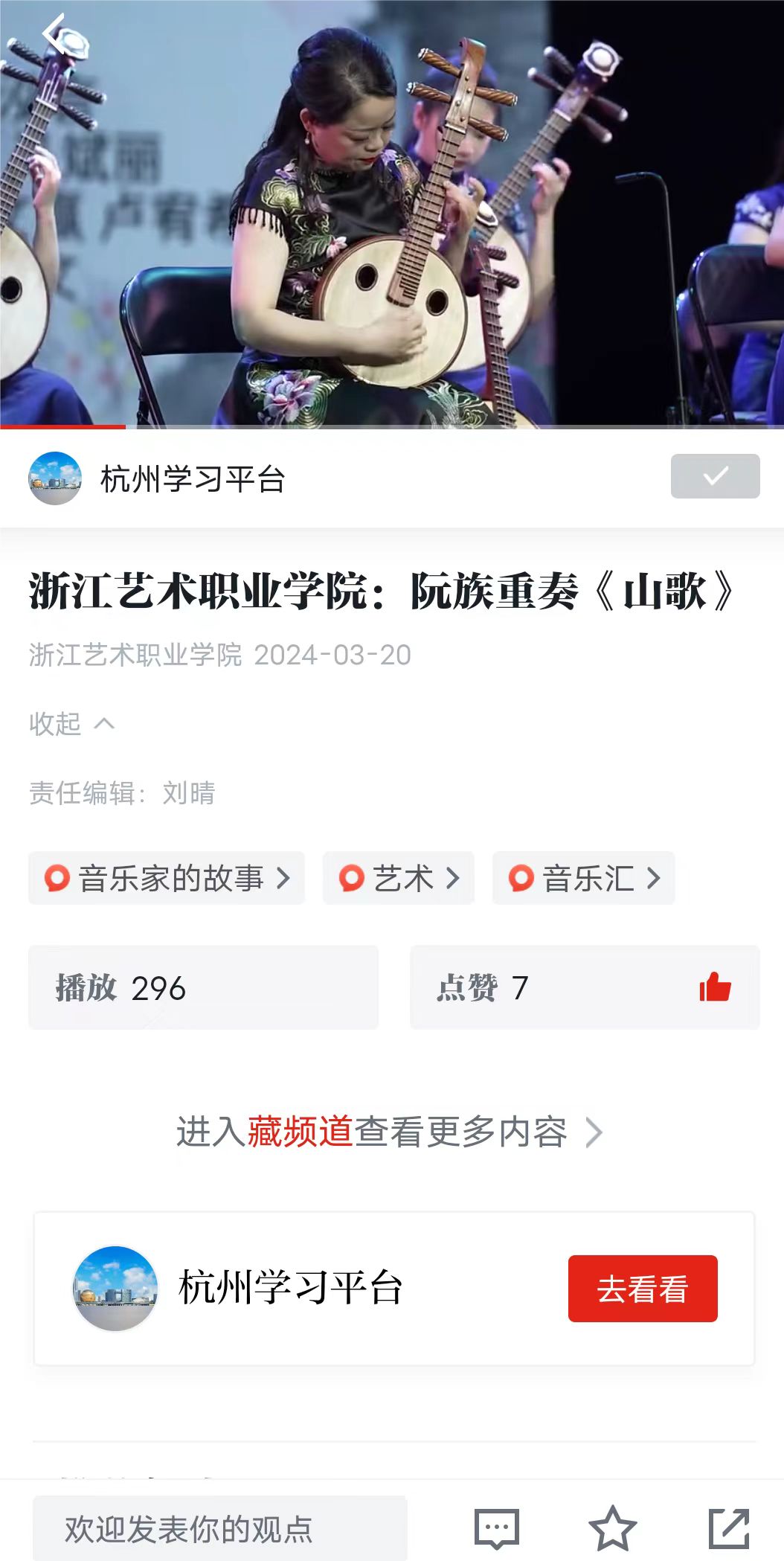 学习强国全国平台:浙江艺术职业学院:阮族重奏《山歌》