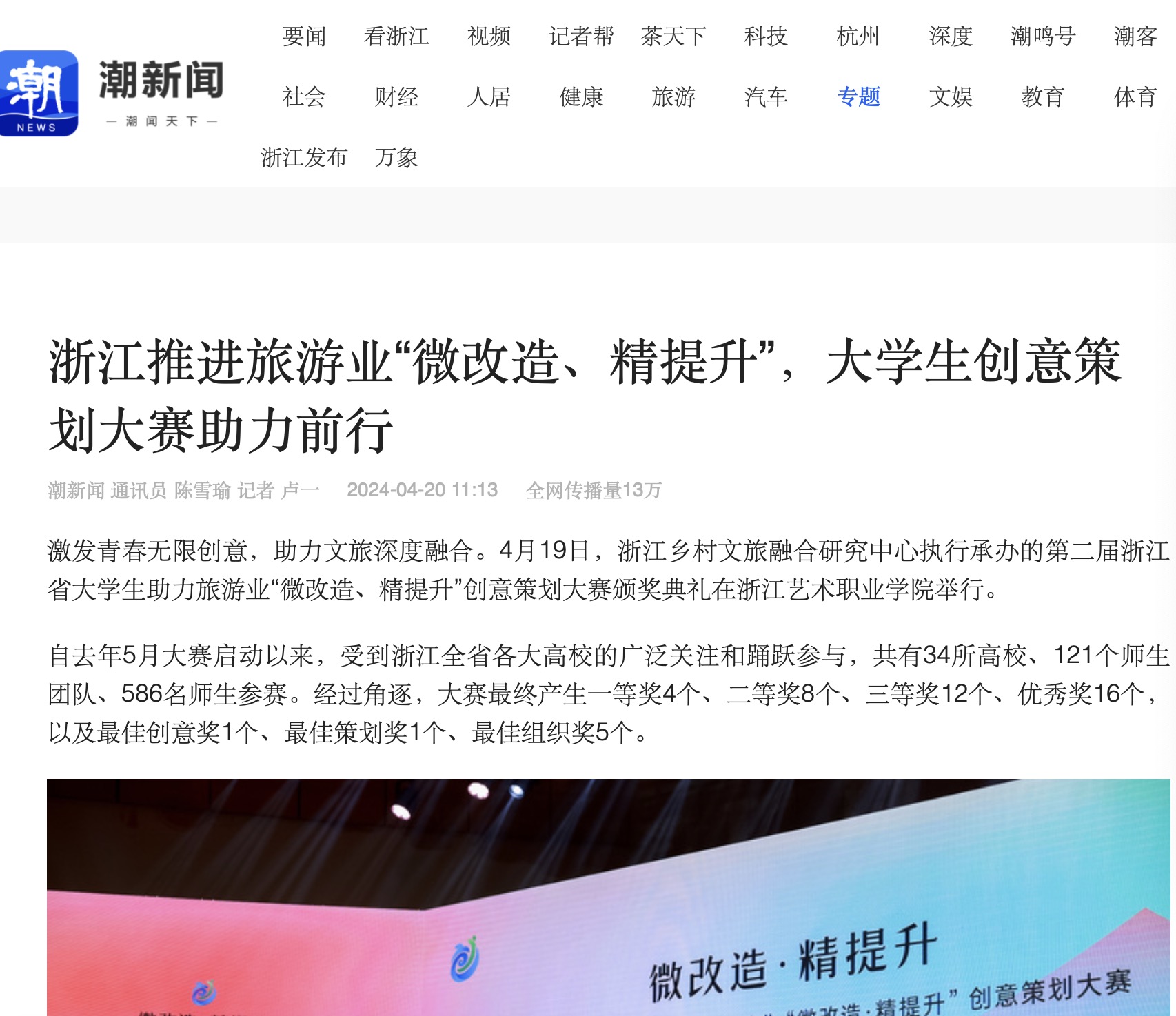 激发青春无限创意,助力文旅深度融合。4月19日,浙江乡村文旅融合研究中心执行承办的第二届浙江省大学生助力旅游业“微改造、精提升”创意策划大赛颁奖典礼在浙江艺术职业学院举行。