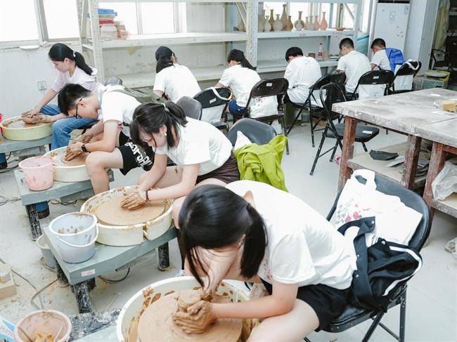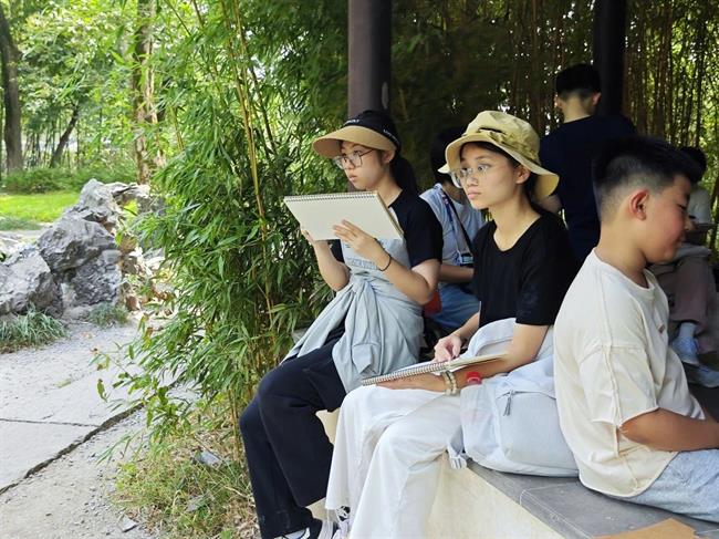 在湖州,他们学习文字的起源与发展,汉字的书写、传播、应用和传承,并亲手创作一幅汉字水墨作品;参观嘉业堂藏书楼、张石铭旧宅、小莲庄等蕴含江南文化深厚底蕴承地方,并将它们用画笔定格在纸上;溯源“两山”文化、寻源湖州历史;聆听非遗传承人的讲述,深入直观地了解湖笔制作项目的工艺流程与技艺特点;体验桑基鱼塘与含山蚕桑养殖等蚕桑文化,综合立体多面地感受中华非物质文化遗产的魅力。在浙江艺术职业学院,通过陶艺体验、漆扇绘制、非遗观摩等,了解学校如何将人才培养、非遗研究和产教融合于一体,让非遗活态传承;在西泠印社,学员们走在百廿名社园林之中,感受传承千年的印文化。