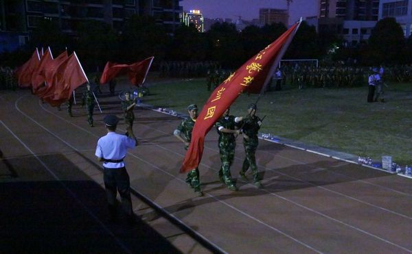 拿着旗帜的同学,整晚都在跑道上练习,连休息的时间都没有。他们知道自己是每个营的代表,肩上有着教官和同学们的期待和信任。