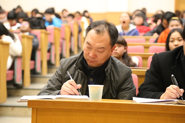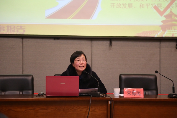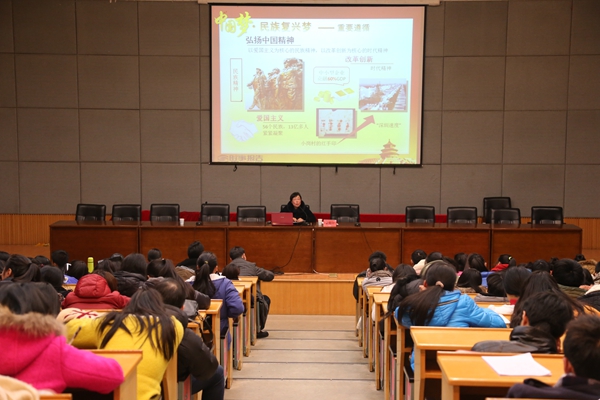 讲座中,朱海闵以“我的梦”为起点,通过中国梦·民族复兴梦、人民幸福梦、改革开放梦和人人出彩梦四方面一一来概括和阐述中国梦的具体内涵。她说,中华文明曾经以其独有的特色和辉煌走在世界文明发展的前列,伴随资本主义生产方式的兴起,中国渐渐没落。但中国人的梦想从未泯灭,有着梦想的支撑,民族开始振心,改革逐渐开放,人民走上幸福道路。想要实现中国梦,必要传承先辈的创新奋斗的精神,只有把“中国梦”与“我的梦”相结合,在思想上、实践上不断追求进步,才能赢得光明的前景。朱海闵列举了阿里巴巴创始人马云、海尔CEO张瑞敏,核物理科学家邓稼先等世界著名的中国人的事例,从重表达了拥有梦想对于每个人未来发展的重要性,强调中国梦是发展梦,是和平梦,是造福世界的梦。朱海闵对同学们提出五点要求:即把握学习机会,练就过硬本领,掌握更多能力,锤炼意志品格,勇于创新创造。她说,只有努力实现自己的的中国梦,才能构建国家富强,民族振兴,人民幸福的中国梦。