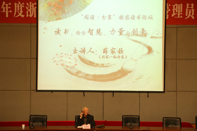 薛家柱从为什么要读书、读书的意义和作用、读什么书、怎样读书四个问题入手阐述读书带给我们的智慧、力量和创意。关于为什么要读书这个问题,他引用习近平的“要爱读书,读好书,善读书”和钱学森的“人一方面要有科学的创新精神,另一方面要有艺术的想象力和创造力”的话,以习近平和李克强爱读书、韩国的服饰和韩剧、日本的动漫等例子,说明当今社会竞争获胜的关键在于知识和创意,而它的来源和根本就是读书。在读书的意义和作用中,他表示读书可以增加知识、可以娱乐、可以陶冶品性、可以教化心灵。他以个人经历为例,讲述一本书可以决定一个人的一生。年轻时,他阅读巴金的《家》和罗曼罗兰的《约翰·克利斯朵夫》,这两本书带给他无限思考,促使他决心为写作事业奉献一生。在介绍读什么类型的书时,他将书分为文史类、科学类、哲学类和影视类,他建议学生不仅要读网络书,更应该多读纸质书,特别要多研究经典名著,必要时要须添加备注,撰写心得体会。在谈到怎样读书这个问题时,他与在座的师生共同分享阅读经历和阅读体会,希望大家能广读书、精读书、做到学以致用。薛家柱与浙江艺术职业学院的缘分颇深,曾担任学院第一届微电影大赛的特邀评委,对学院举办的微电影大赛给予充分肯定,希望学生能多多积累生活经验,多从书中得到启迪,多锻炼个人的想象力,拍出更多有丰富内涵的艺术作品。