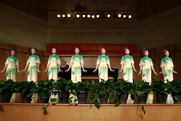 本场音乐会以我国古代诗词歌曲和传统戏曲选段为主要内容,探索、体验我国独特价值的演唱传统,为继承发扬中国传统声乐的审美观念与艺术表达尽绵力。音乐会以一曲优雅婉转的女声独唱《忆江南》拉开帷幕,无论是女声独唱《关雎》《紫菱洲歌》《红豆曲》《阳光三叠》《梨花颂》《春晓》《杏花天影》,还是男声独唱《枫桥夜破泊》《登黄鹤楼.送孟浩然之广陵》《大江东去》,参演的老师、同学都声情并茂、各具特色地展现出娴熟的专业技巧。男女声二重唱《蔡郎哥哥他要走》《木兰辞》,女声的细腻与男声的淳厚结合得淋漓尽致。音乐会最后在女声小组唱《四季花开》与《采茶舞曲》的欢快歌声中结束。