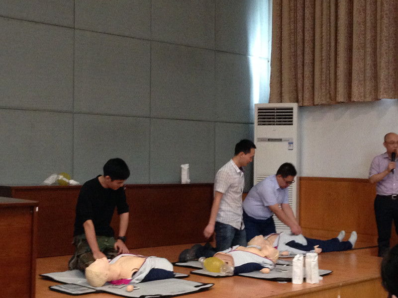 朱宁副教授是心肺脑复苏问题方面的专家,他从部分名人、艺术家的突发疾病死亡入手,引导大家认识并正视心脑血管疾病的潜在危险。他介绍了心脏骤停的原因、与其他类似疾病的区别及其应急处理办法。在实践操作环节,他现场为大家演示胸外心脏按压和人工呼吸的具体操作方法,在场的老师们纷纷上前学习、演练并提出自己的疑难问题。他一一给与解答,现场气氛热烈、成效显著。