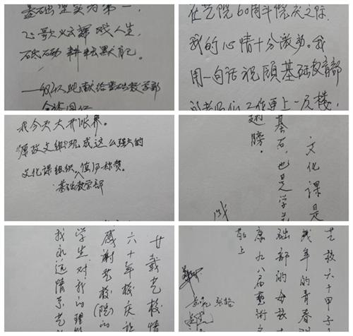 老教师们分享了当年在校工作时的情况和育人心得。裴美影说:“政治教学要了解学生思想,特别是理解学生的叛逆心理。”一语道破政治课教学智慧。谈到文化课教学的作用,成德溥老师语重心长地说:“文化课学得好的学生,都有出息了。”她还回忆起当年要求学生坚持写周记、作文并给予详细批阅,多年后那些曾“叛逆”的学生纷纷表示受益匪浅。老教师们追忆昔日教学往事之际,不禁想起周迅、章小敏、殷放、董卿等知名校友的历历往事,畅谈文化课教学对艺术生成才立业的重要性。史长虹向退休老教师和校友代表们汇报了基础部大事记和近年来的发展情况,抚今思昔,与座师生都深感欣慰。随后的题词环节,大家都表达了诚挚祝福和寄语,如“文化课是艺术的基础,也是学艺术飞翔的翅膀。”、“万丈高楼平地起,基础牢固是第一。”等等,学院老领导俞剑咏也通过视频表达了对院、部的热烈祝贺。临近尾声,基础部领导向退休老教师们奉上独具特色的部门文化杯,以表对前辈们辛勤奉献的深切感谢与浓浓祝福。