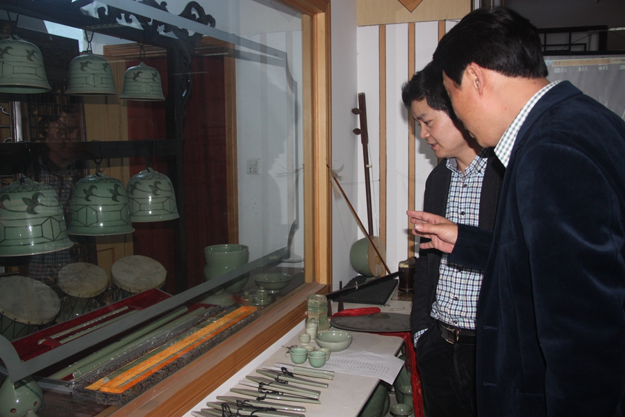 慈溪青瓷瓯乐艺术团团长谢杰锋等热情地向调研组来宾介绍了青瓷瓯乐艺术团的发展历程、近年来所取得的成果,希望能携手浙艺院将瓷乐文化发扬光大。艺术团的艺术家们现场演奏了瓯乐合奏曲《春晓》、瓯胡二重奏《窑工乐》等曲目,清脆的瓷乐声吸引了来自音乐系、科研处等调研组专家们亲自体会其中妙趣,饶有兴致地与演员们切磋交流瓷器的发声韵律。调研组一行还观看了青瓷艺术团近年来在国内外演出的视频,其独特的创作和精湛的演奏令人称赞。张建国表示,美妙的瓯乐需要大力传承和发扬,非常希望青瓷瓯乐艺术团能来我院演出,开拓学生们的视野,增进交流沟通。