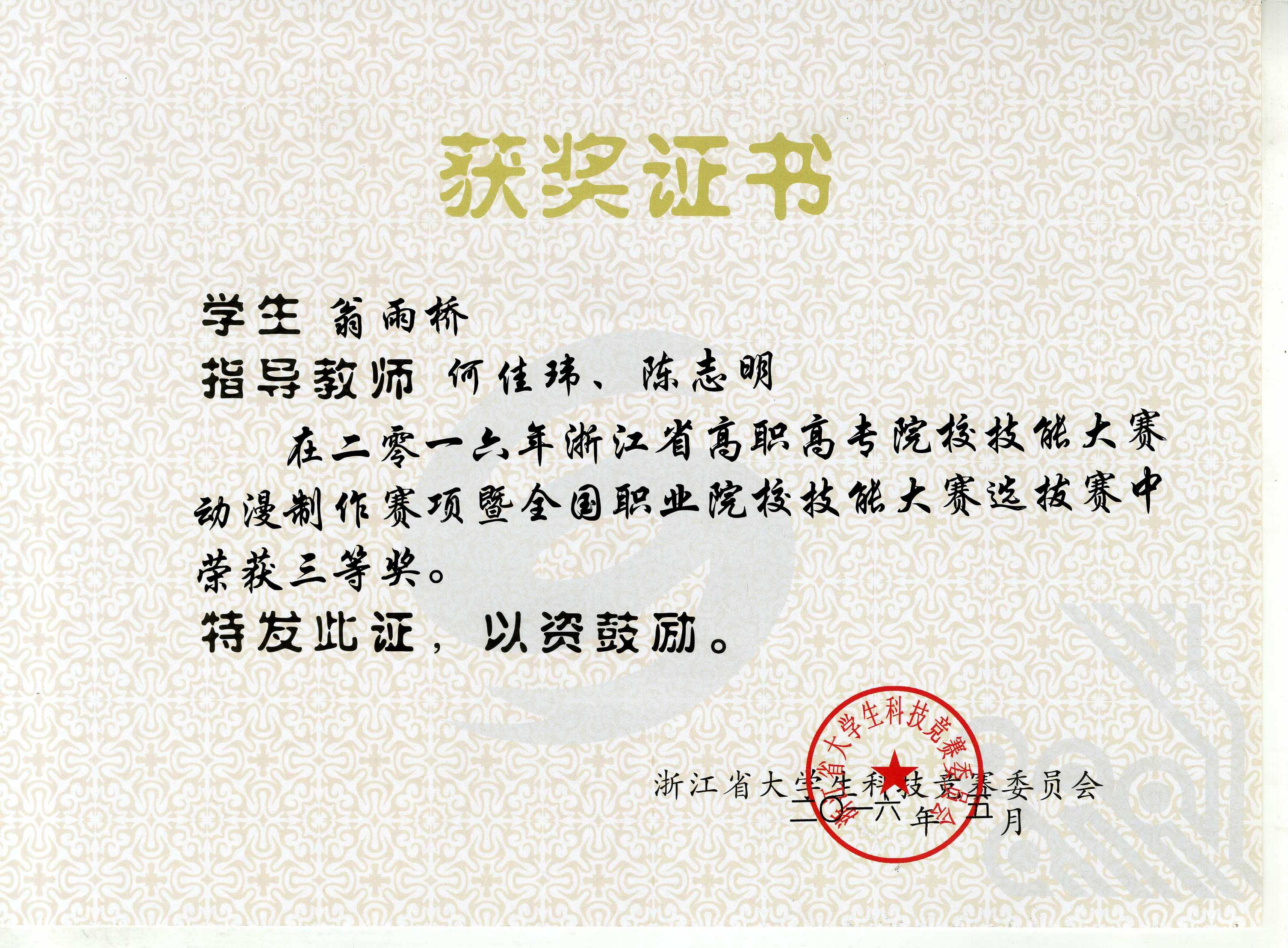 5月6日至8日,浙江省高职高专院校技能大赛动漫赛项在台州职业技术学院举行。我院美术系动画专业学生陈佳佳、翁雨桥和刘家鑫与来自全省众多高职院校的选手竞技,分获三等奖。