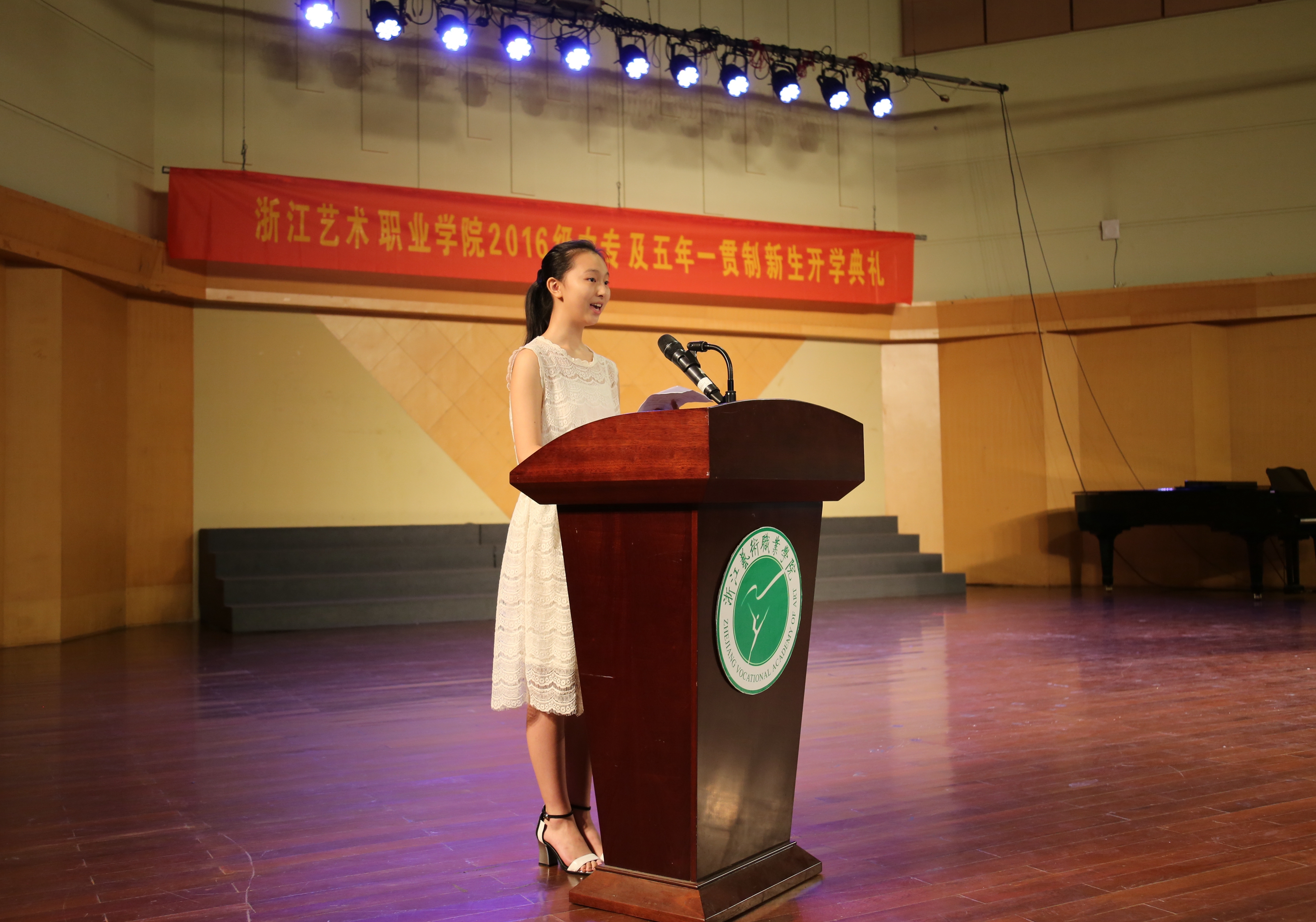 新生代表、2016级舞蹈系五年一贯制班的石尚同学在发言中说到:“浙艺名师荟萃,他们都是浙艺的骄傲,也是我们学习的榜样。浙艺承载着我们的梦想,也寄托着我们对明天的希望。我们要尽快适应新环境,为自己树立明确的目标,一步一个脚印,一步一个台阶,刻苦勤奋,努力学习。” 典礼上还播放了学院60周年校庆宣传片和迎新视频以及各系党总支副书记給同学们的寄语。