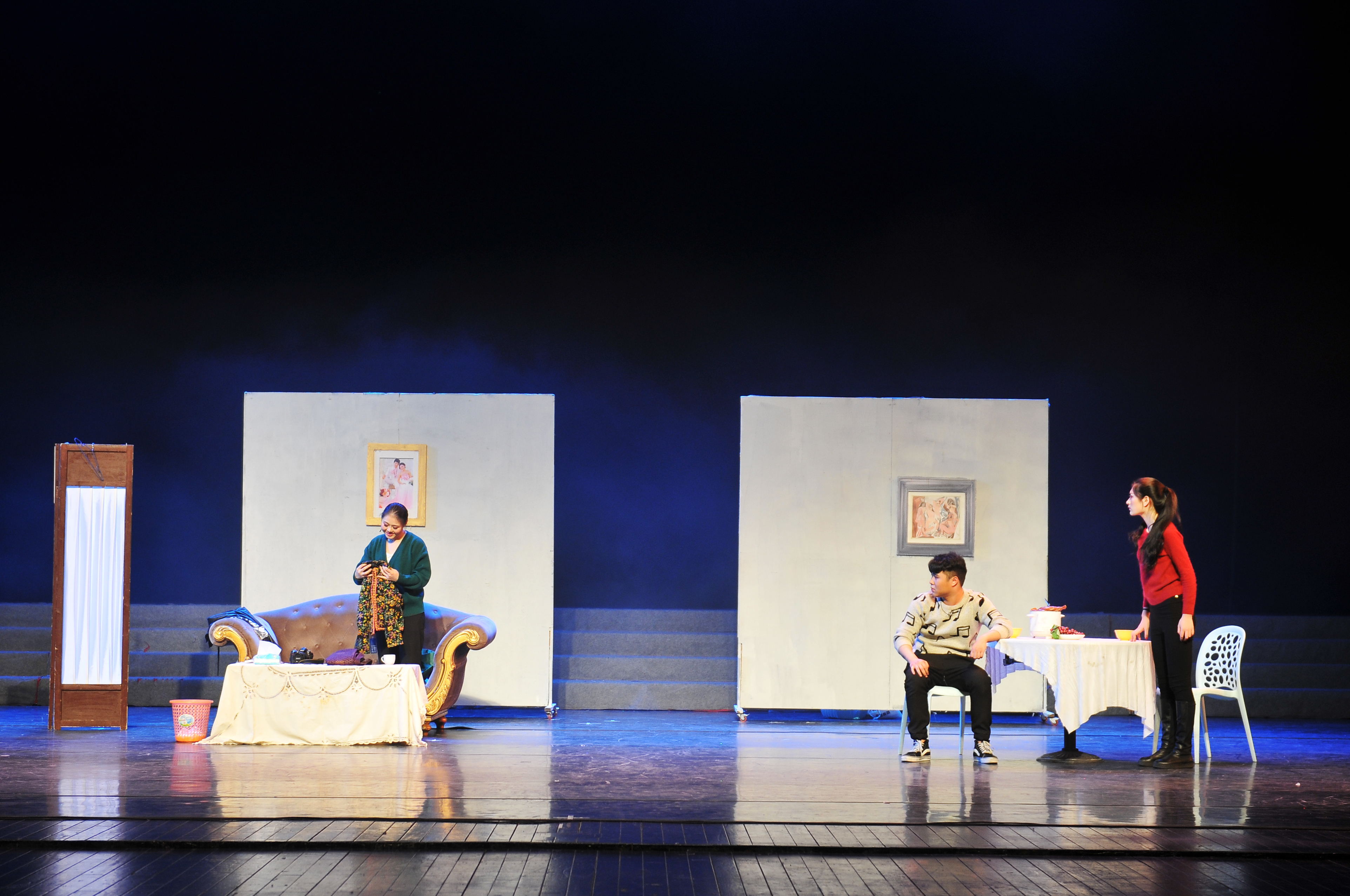上海戏剧学院教授张金娣、兰州军区文工团一级演员孙学增、钱江浪花艺术团总经理陆湘汉、戏剧系党总支副书记李旭芳、表演艺术专业带头人荆芳参加研讨,对两个作品有关人物行为逻辑、性格刻画等方面提出了意见和建议。由2012级表演艺术五年一贯班学生创作并表演的原创作品《寝室“味道”》,其主题、形式新颖,在表演中融入了锣鼓经、戏曲身段等表现形式。这段时间,同学们夜以继日、紧张排练,在剧本上和表演上及时调整,一次次地完善提高。几位参赛同学说,“很高兴能参加省大艺节,我们要尽自己的努力,争取在展演中发挥好。”