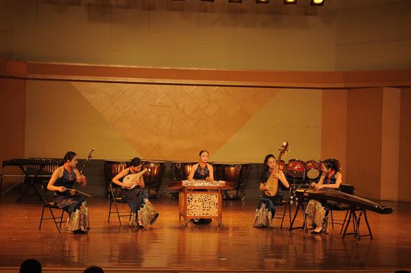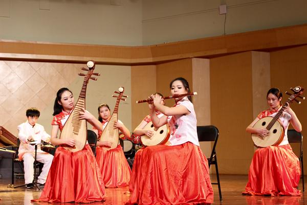 音乐系民族管弦乐团带来的具有浓厚民族特色的开场曲《节日》描绘出云南各民族人民共庆节日的热闹场面,音乐抒情而优美,沸腾而热烈。紧接着的《赶街》用明快优美的旋律和层次清晰的配器,形象地描绘了苍山洱海之间“赶街”的生动画面。扬琴重奏《乡村·善水》取自扬琴重奏曲《乡村抒怀》和《甲午善水》两首作品的精华,曲调优美抒情,抒发了具有乡村音乐风格的人文情怀,描述了浙江省五水共治的场景。该重奏组曾获2016年全国第三届扬琴大赛专业重奏组银奖、第三届国际香港音乐节重奏组一等奖。指跃弦上,音嵌弦中,曾荣获浙江省“新松计划”器乐大赛铜奖的音乐系民乐班赵雨舟同学带来了中阮独奏《中阮第二协奏曲》,此曲的演绎需要运用独特的表现手法将中阮演奏技巧发挥到极致,赵雨舟同学用自己所学带给了我们美的享受。小调悠扬,纤指轻拨,丝弦五重奏《欢乐的夜晚》《跃龙》将中国民族丝弦艺术发挥得淋漓尽致,同时借有西方重奏的技巧特点使得乐曲更具艺术感染力。弓弦乐团带来的《病中吟》将乐曲分为三个乐段和一个尾声,将悲愤激昂之情寓于之中,感染着观众的内心。新苗江南丝竹乐队用丝竹风情演绎了《绿野》,此曲创作1987年,曾获1987年“第一届海内外江南丝竹创作与演奏比赛一等奖”。丝竹的悠扬之音,生动地表现了江南水乡美丽风光以及冬去春来万物更新的景象。