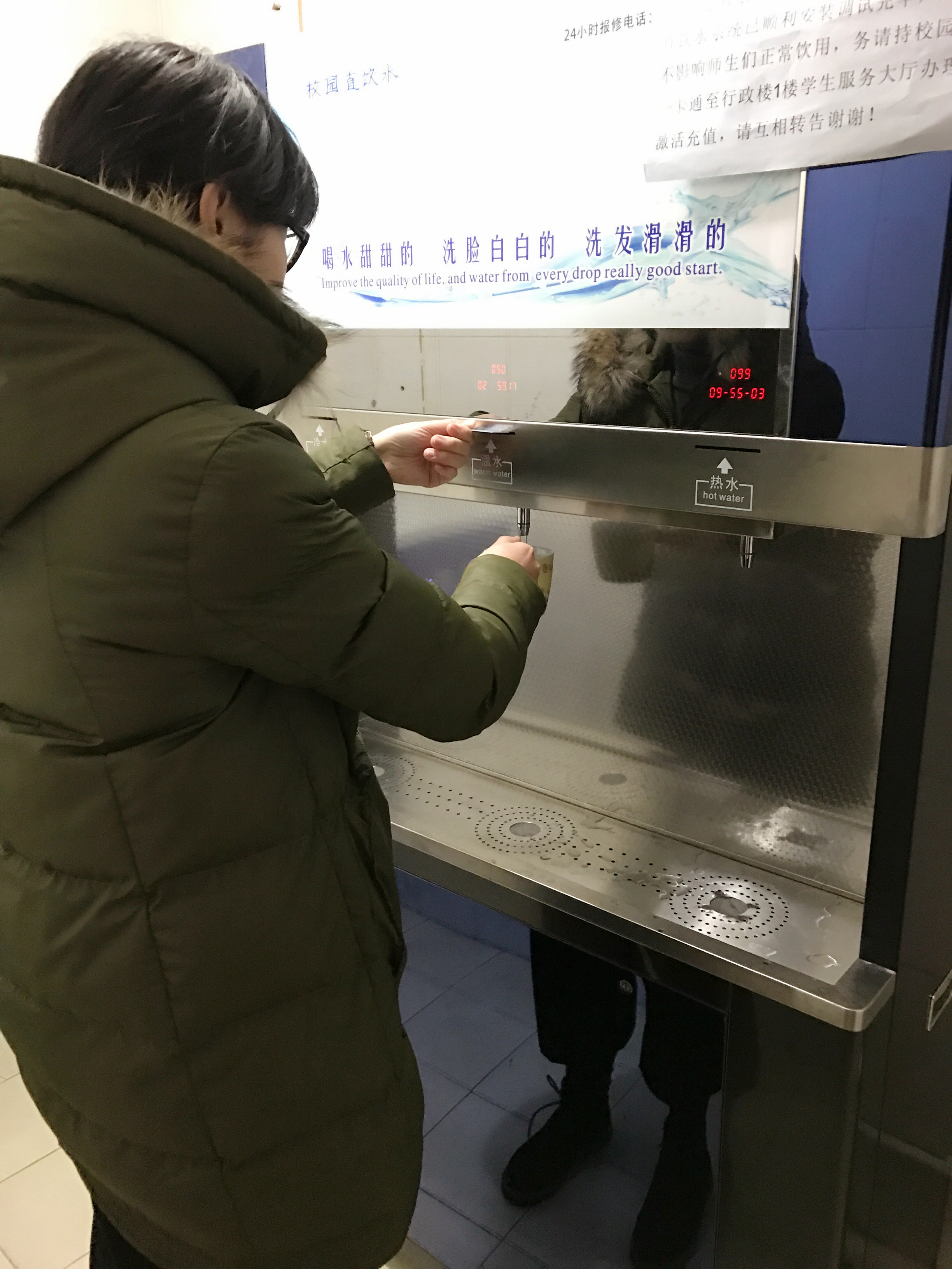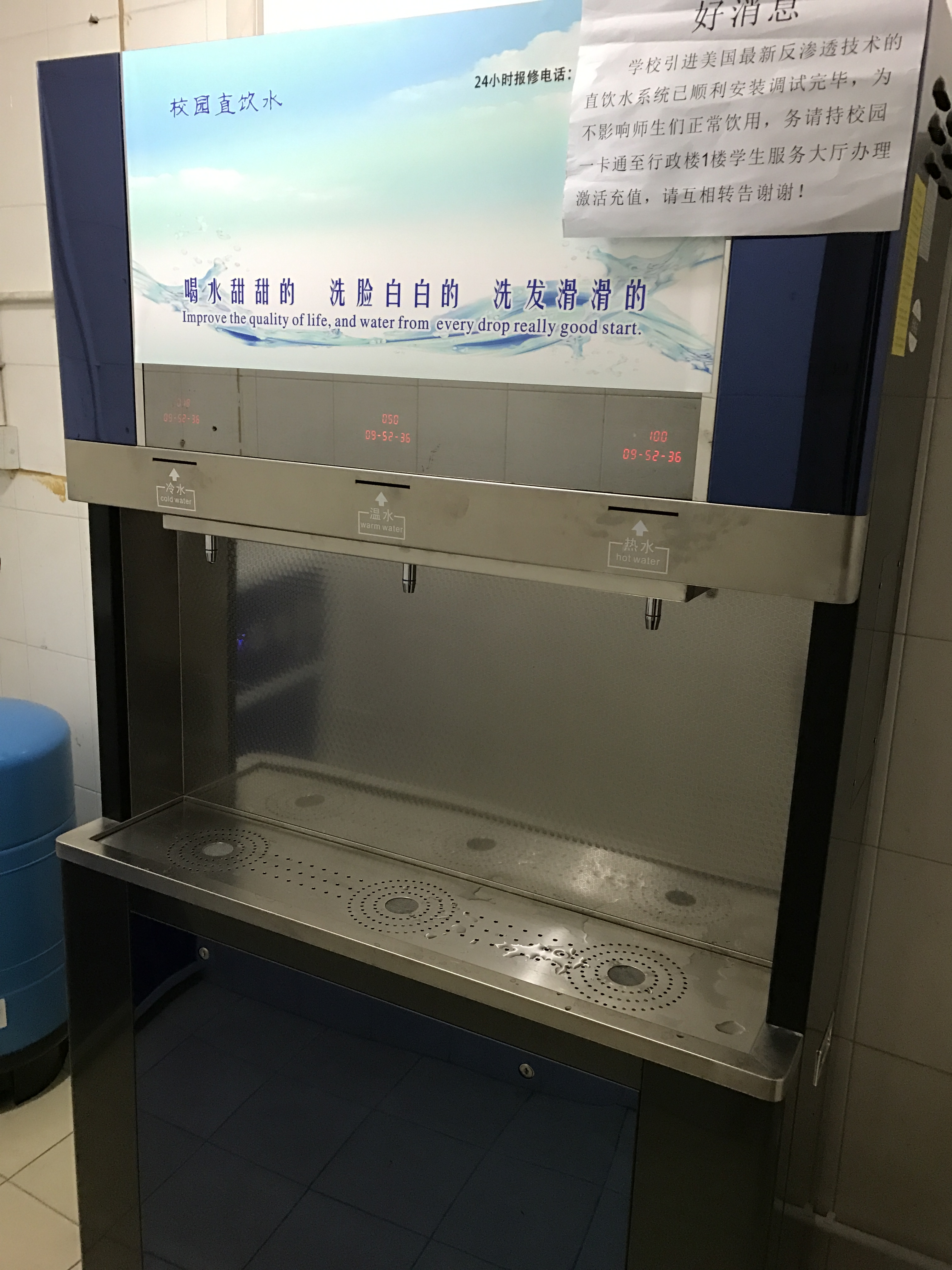作为院工会2016年度“扎实推进职工服务之家”工作重要内容之一,早在2016年初,院工会便就此事协同总务处关于如何通过净水系统改善水质做了前期论证工作。鉴于同在滨江高教园内的兄弟院校浙江中医药大学的良好使用体验,我院工会牵头召集总务处和后勤公司负责人曾前往浙江中医药大学杭州富阳新校区对净水设备使用情况进行实地考察。通过周密的前期了解、实地考察和咨询,结合学院建筑单体目前增设净水器材的安装条件,遂决定采用与浙江中医药大学富阳校区同类型的净化水设备,在校园内(含东冠校区)统一安装。所有直饮水机设备均使用“校园一卡通”计量取水,学生按每升0.38—0.5元标准由厂家负责收取,教师免费定量使用(每月不超过50升)。“校园一卡通”充值时间安排为:每周一、三、五9:00至17:00,地点在一号楼学生服务大厅;每周二、四9:00至17:00和周日13:00至17:00,地点在东冠校区。净水设备是完善学院后勤保障的一项重要举措,极大地改善了长期以来学院师生饮用水水质,受到师生欢迎。