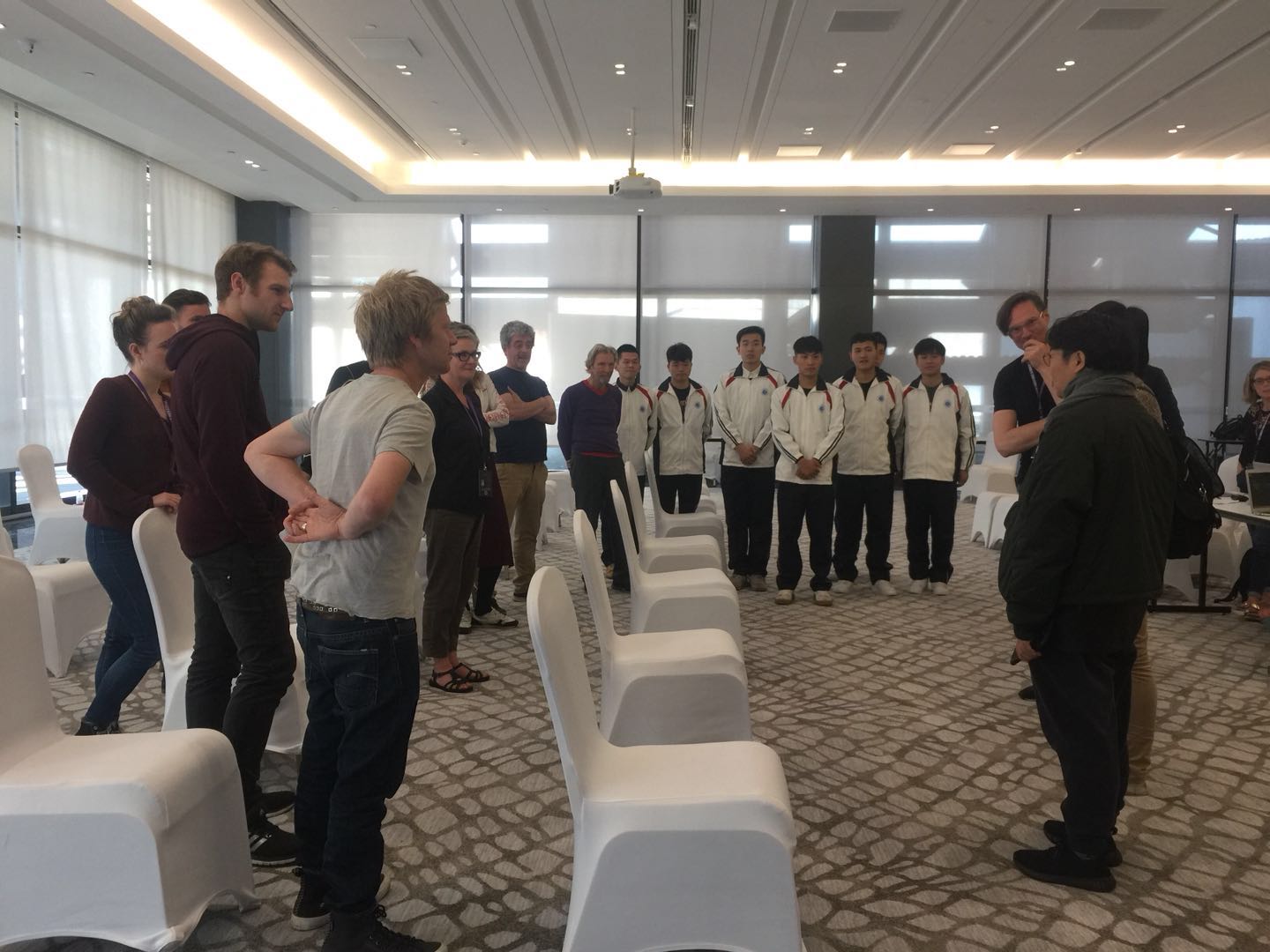 10月21日下午,参演《海选哈姆雷特》七位男生先到乌镇,即刻开始和副导演进行对词和走位的排练。第一次见到爱尔兰剧组,同学们显得十分兴奋。排练结束,导演对同学们竖起大拇指,“hey man”、“good”、“nice”,这样的词汇让同学们倍感鼓舞。期间,乌镇戏剧节年度艺术总监、著名导演田沁鑫特地到现场看望了同学们,让同学们倍感温暖。10月27日晚,特邀剧目《海选哈姆雷特》在网剧场正式演出,剧场内座无虚席。首演大获成功,七位学生演员获得了爱尔兰剧组导演的高度评价和观众的赞扬。兰州大学表演系的老师表示:“同学们的表现很棒!个头、形象、台词全活了!”