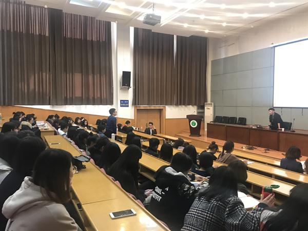 讲座过程中,金成用轻松幽默的话语营造了愉悦的氛围。他先从不同角度与同学们畅谈对室内设计师这一职业的认识,着重强调了设计师的两个方向,接着介绍了室内设计的八大风格。然后,根据个人工作经验,生动、详尽地介绍了室内设计实践项目的应用,提出运用服装设计与室内设计相互通用的见解,鼓励同学们深入研究,为在座师生指出诸多较有发展空间的研究方向。