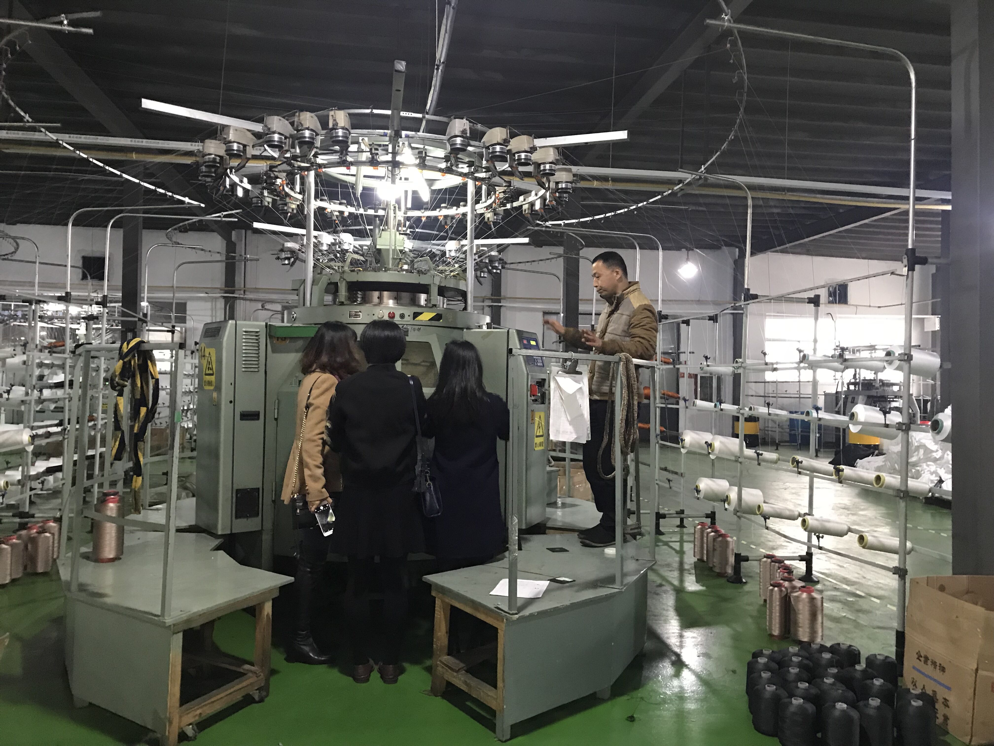 老师们参观了公司印花部、制造部等多个生产部门,观察了热转印数码印花的完整流程,包括数码打印和热转印过程,在交流中深入了解到数码印花从材料到工艺的全面环保性及在使用过程中的温度要求。随后又参观了厂区内多台高速箭杠机、电子龙头提花机及进口圆机等先进设备,各教研室主任分别与公司负责人交流专业领域相关问题,并积极推荐优秀毕业生就业。