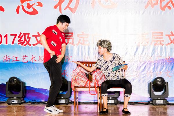 本次走进文化礼堂汇报演出活动,不仅是对2017级乡镇文化员定向班全体同学在浙艺学习一年的阶段性成果检验,通过深入各地文化礼堂演出,更是为他们熟悉、了解将来的工作环境、工作内容提供了机会,因此学生们都非常重视,全身心投入到此次演出的筹备、实施过程中。为保障演出的顺利进行,同学们自主协商分成道具组、化妆组、宣传组、后勤保障组等,全面承担起整台演出的各项工作,充分体现了“一专多能”的复合型人才要求。与表演系学生到文化礼堂演出所不同的是,乡镇文化员定向班得汇报演出不只是为当地百姓送去文艺节目,更是要走进不同乡镇的文化礼堂,考察当地博物馆与文化馆,实地深入了解当地的民俗民风和历史文化,便于将来工作之后能胜任基层文化员岗位,真正做到将文化送入千家万户。