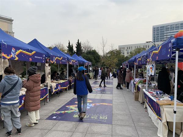 走进红色的“彩虹门”,便能看见那摆放在摊位旁的“小胖子”。这一处是广告创意产品,主题是“变形记”,展卖的有红色小胖子形象的贴纸、文件袋、健身日记、水杯等,创作者们介绍,这个设计是想要大家树立科学减肥,科学健身的理念。现场还能参与中奖机率较高的抽奖活动。“天绮咏古” “覆海”两组产品的灵感来源于敦煌壁画,设计者们希望年轻人能更多地喜欢中华传统文化,产品有抱枕、帆布包、红包等等。带着水果图案的手机壳、钥匙扣、眼罩、闹钟、水杯等“弄器”系列创意产品,旨在将健康知识传递下去,呼吁大家珍爱生命,养护器官,从年轻开始。“良渚玉器”摊位展卖的小首饰、手机壳、丝巾、抱枕等各类小产品精致美观,也有不少人购买。动漫设计的主要产品衍生于一部动画,有饰品、卡通人物、小场景、手提包、小布袋、动漫人物等。环境设计摊位是大家亲手织的围巾、帽子,编织的手提包、手环,样式精美,别出心裁。天气有些冷,可既是创作者又是零售商的同学们热情不减,向来往的人们推介着自己的产品。入了夜,创艺市集点亮了灯,有满载而归的买家,有热情似火的卖家,热热闹闹。学校领导、老师们也纷纷到市集里“淘宝”,支持同学们。