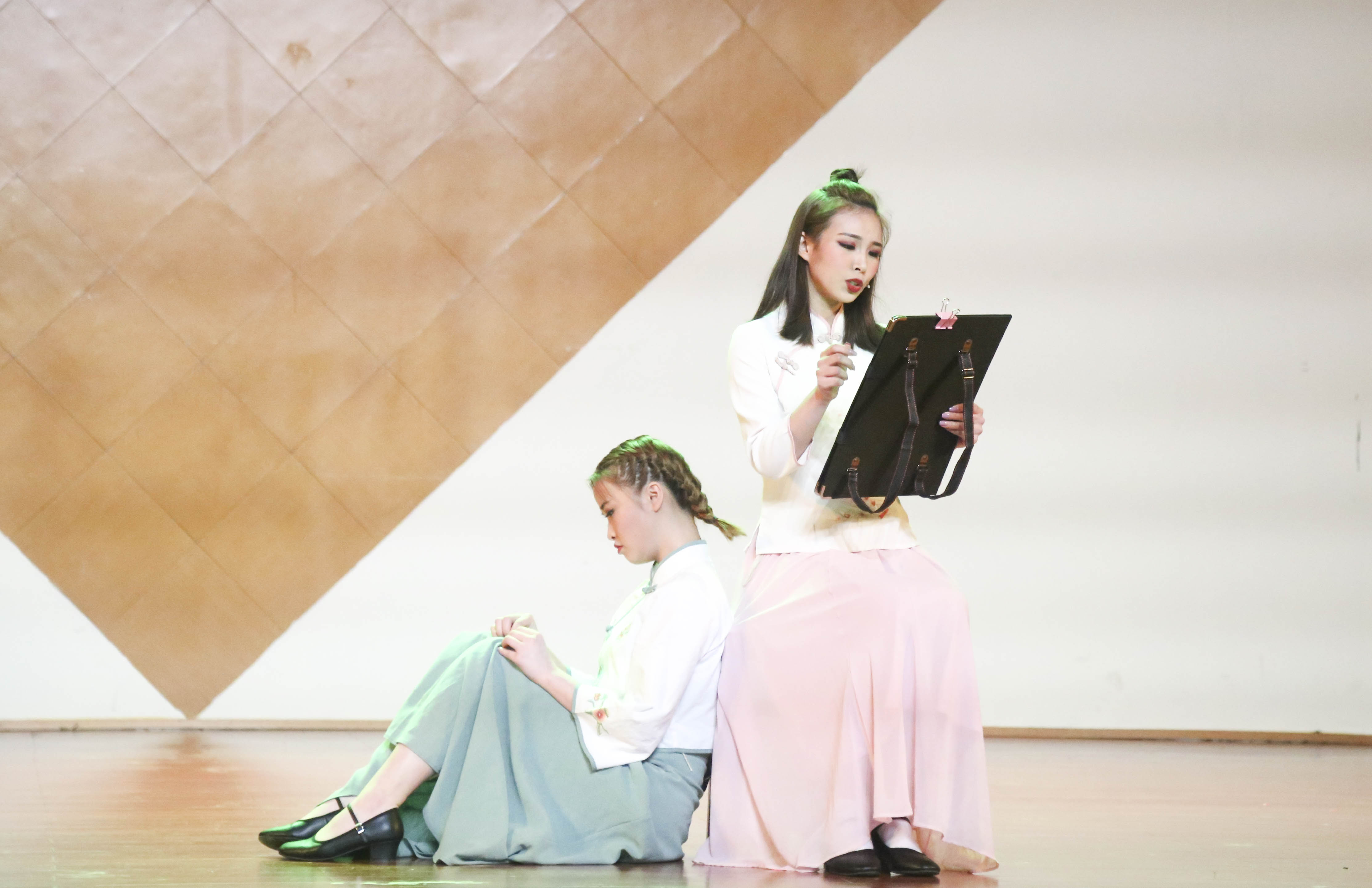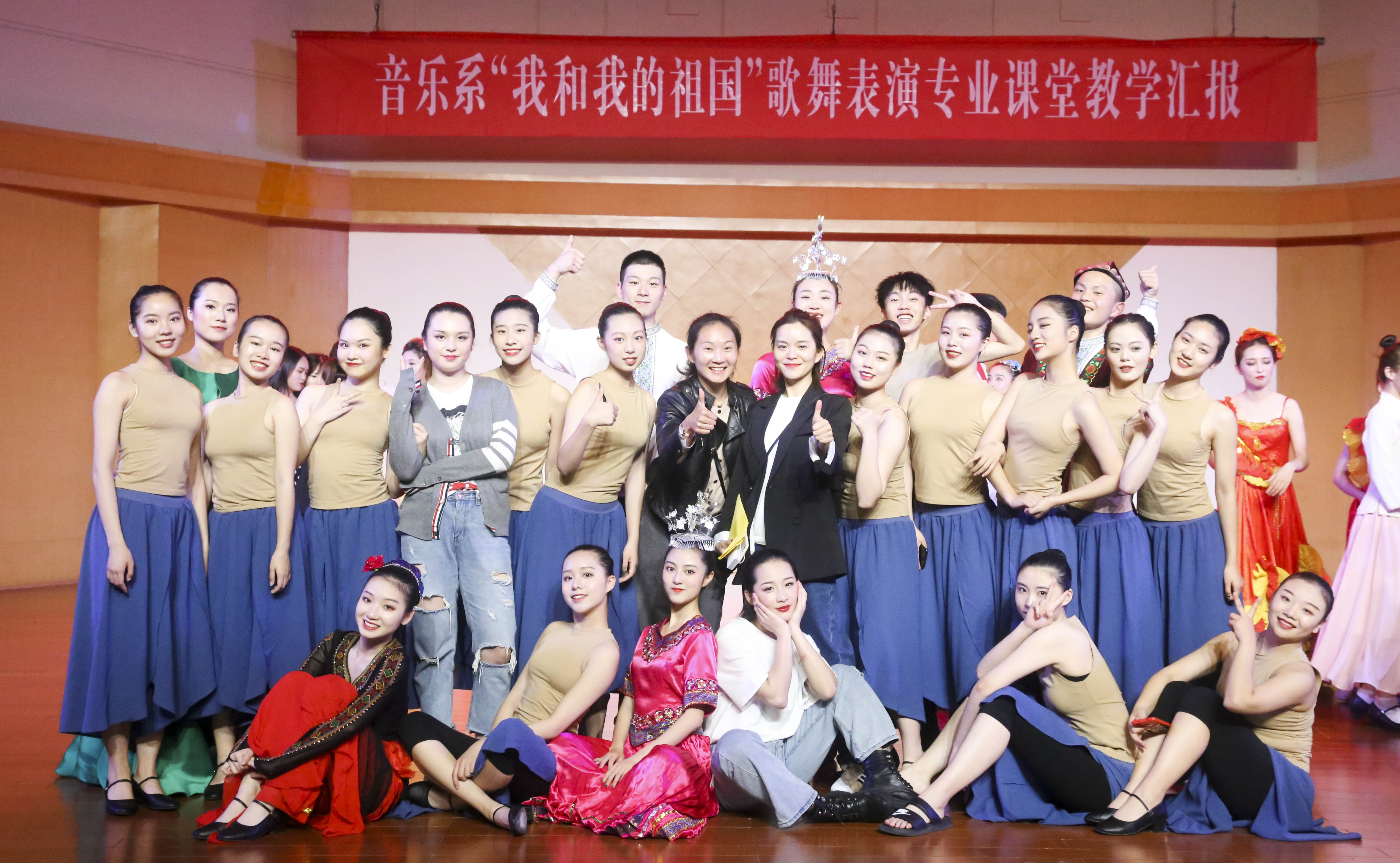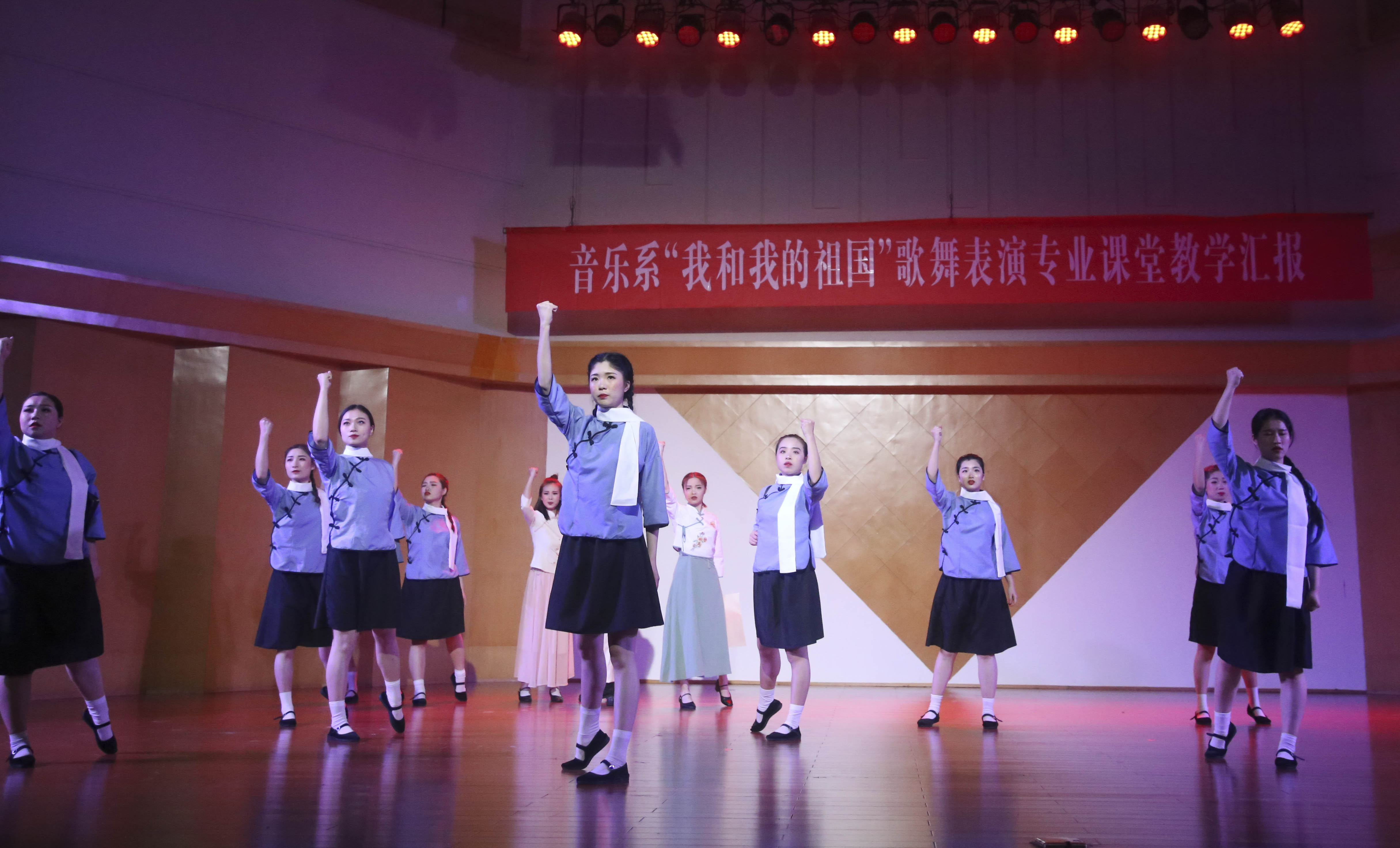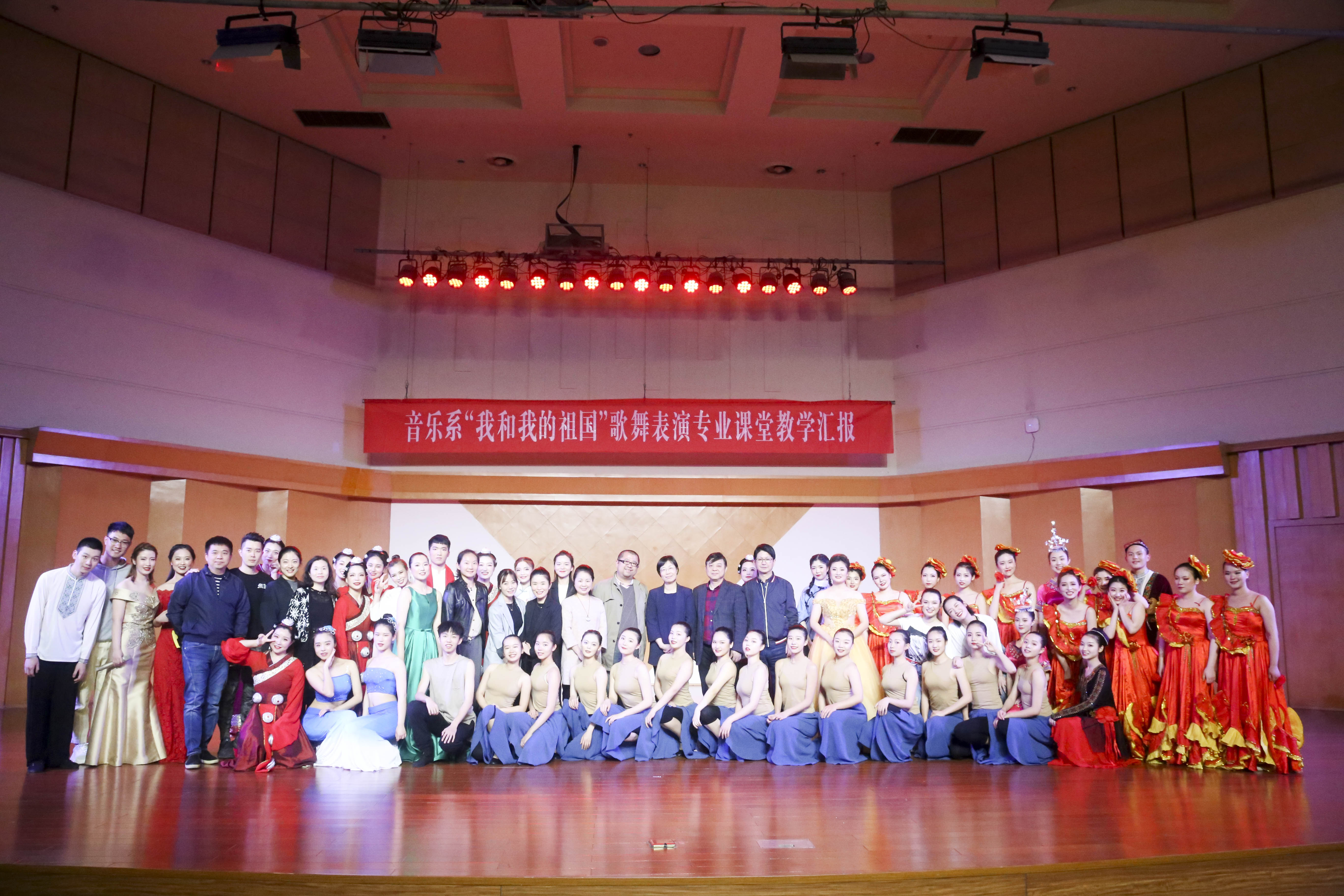 歌舞庆盛世,献礼70年。为献礼新中国成立70周年,颂扬心系祖国的爱国情怀,弘扬和传承中华民族文化,丰富校园文化生活,展现音乐系歌舞表演专业教育教学成果,4月15日,以“我和我的祖国”为主题的歌舞表演专业课堂教学汇报在学校音乐厅上演。校党委书记朱海闵莅临汇报演出现场,音乐系16歌舞一贯班、17歌舞大专班全体学生担当主演,音乐系师生代表两百余人观看演出。