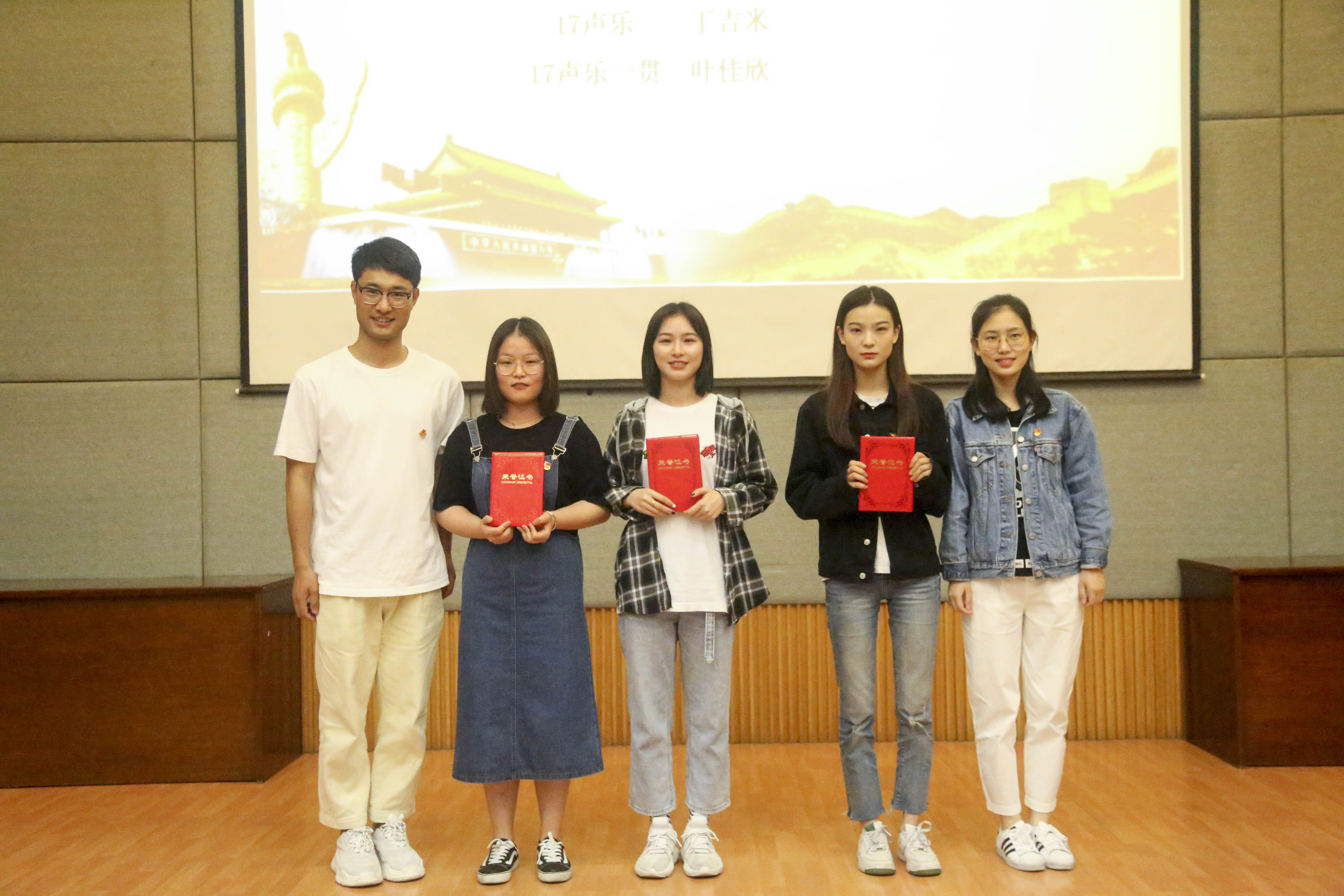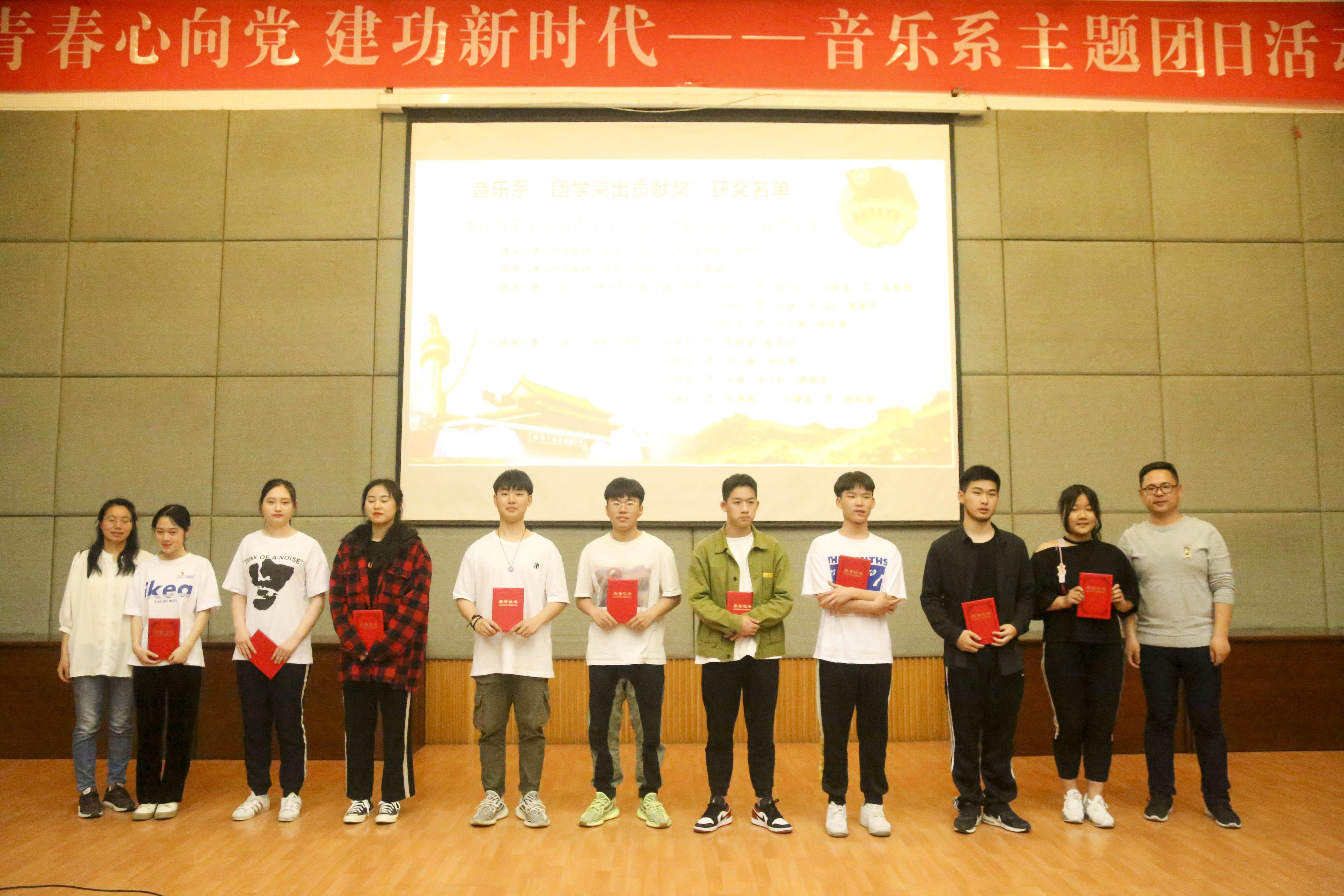 活动现场,对在日前结束的2019年学校红色经典诵读比赛、校园春季摄影征集大赛、浙江省第十五届大学生运动会比赛、音乐系“音你而辩”辩论赛中获奖的19名学生颁发音乐系“团学突出贡献奖”。同时,肯定了过去一年音乐系团学取得的成果,以及过去一年全体音乐系学子在各类比赛、各次志愿服务中展现出的良好风貌和优异成绩,肯定了过去一年音乐系在校园文化品牌建设、党建品牌培育中付出的努力。