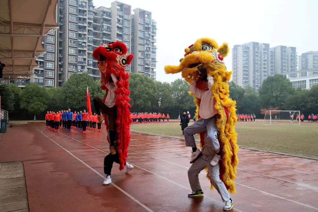 随着铿锵有力、气势磅礴的音乐,18表演艺术班学生带来舞狮助力,耀武扬威的两只雄狮踢跳翻蹬,轰动全场。