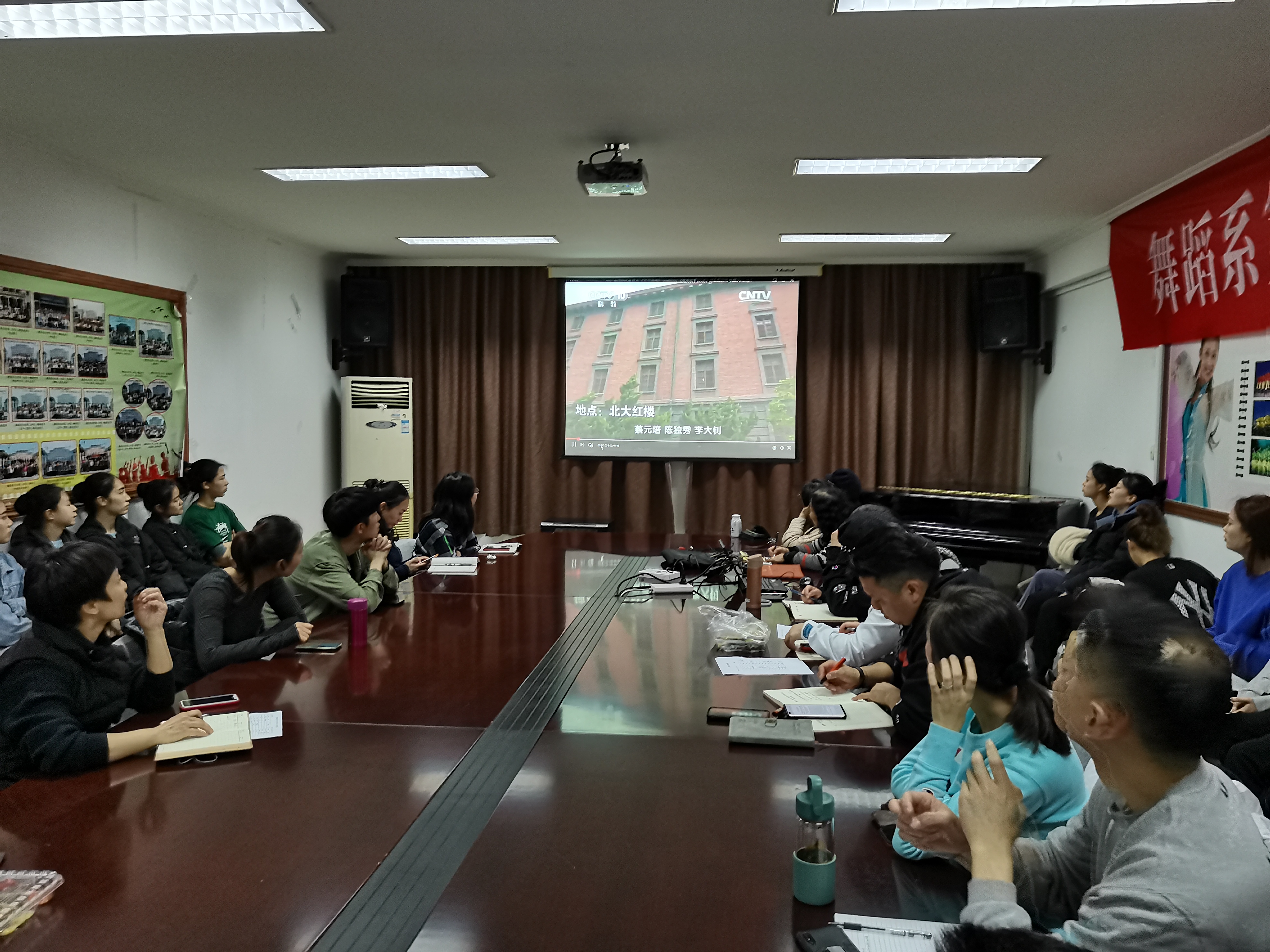 3月17日,舞蹈系党总支组织全体教师党员、教研室主任、专业带头人、入党积极分子,共同收看由中共中央组织部党员教育中心、中央党史研究室宣传教育局、中央电视台科教频道联合制作的特别节目《党史故事100讲》第1、2集——《五四运动 唤醒民众》《首译宣言 传播真理》。1919年爆发于北京的五四运动,开启了中国共产党创建的序幕,中国人民的反帝爱国斗争最终取得了胜利。震惊中外的五四运动是怎样爆发的?五四运动蔓延开来,全国又出现了怎样的景象?解放军后勤学院一级教授邵维正用讲故事的方法娓娓道来。视频中还穿插历史人物、场所环境等珍贵图片,以及记者在现场的介绍等画面,带入感十足,师生们始终看得入神,当年北大学生如何火烧了赵家楼曹汝霖的豪宅,痛打了西装革履的章宗祥等历史画面在脑海中浮现。