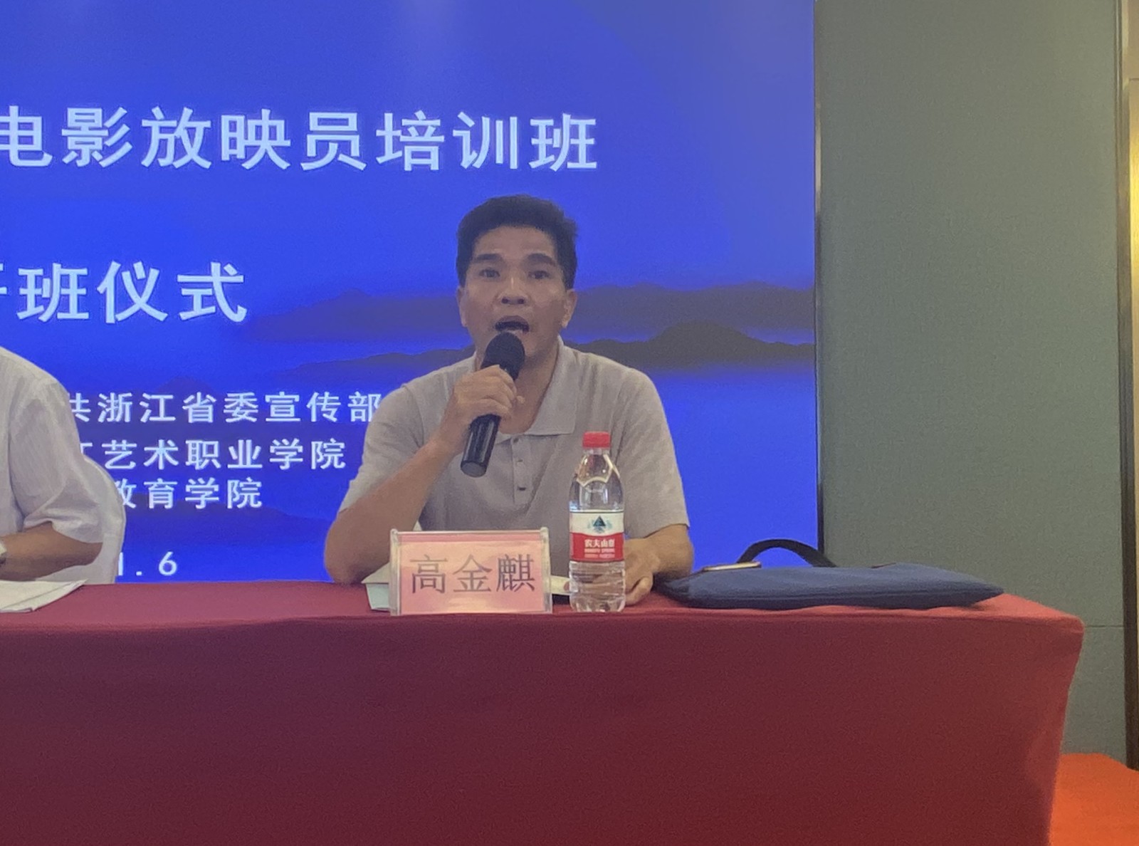 夏开堂致欢迎词。他代表浙江艺术职业学院对省委宣传部一如既往的关心和支持表示衷心感谢,对来自全省电影行业的学员们表示热烈欢迎。他详细介绍了浙江艺术职业学院近70年的办学历史,并着重通过浙艺的前身之一——浙江电影学校与电影事业的渊源,表达了学校对承办本次全省电影放映员培训班的高度重视与深厚感情。他同时介绍,本次培训班依托学校影视技术系和校外优质资源,结合学校多年教学实践经验,在省委宣传部的全程指导下,精心设计了一系列内容丰富、理论性和实践性兼具的课程内容,希望学员们能在浙艺广泛沟通交流,学有所获。