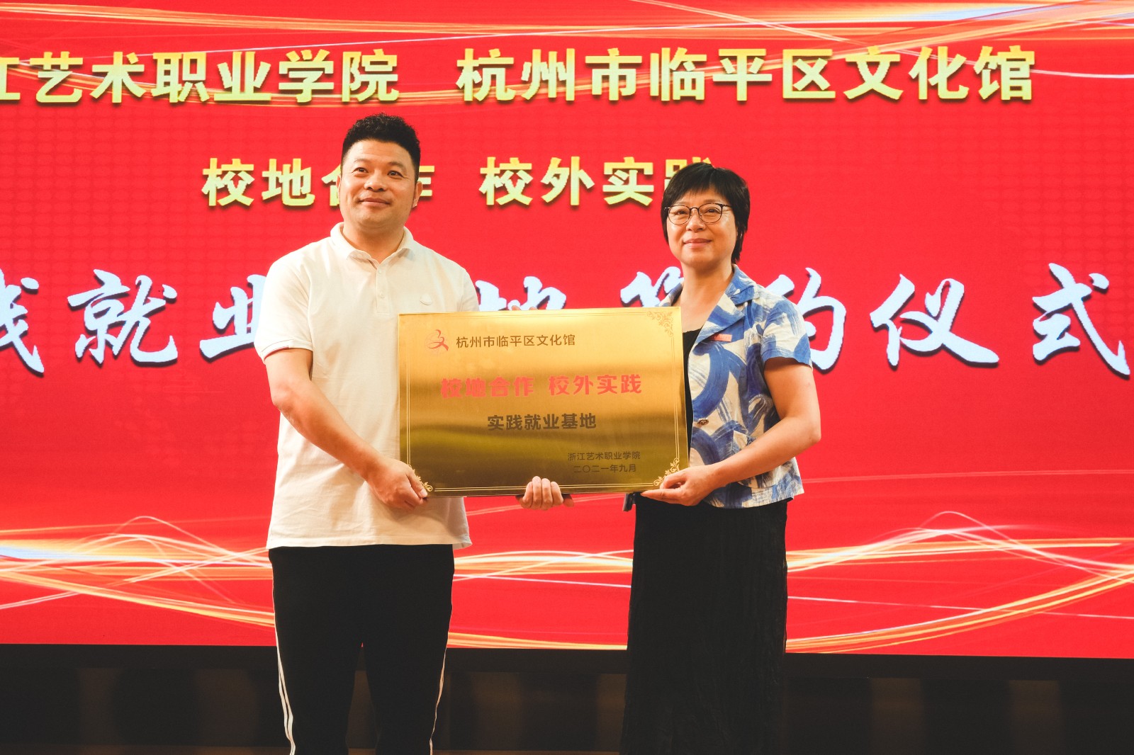 仪式上,临平区文化馆负责人任小伟与戏剧系党总支专职副书记许瑛代表校地双方签订校外实践就业基地协议。戏剧系副主任荆芳为实践就业基地授牌。