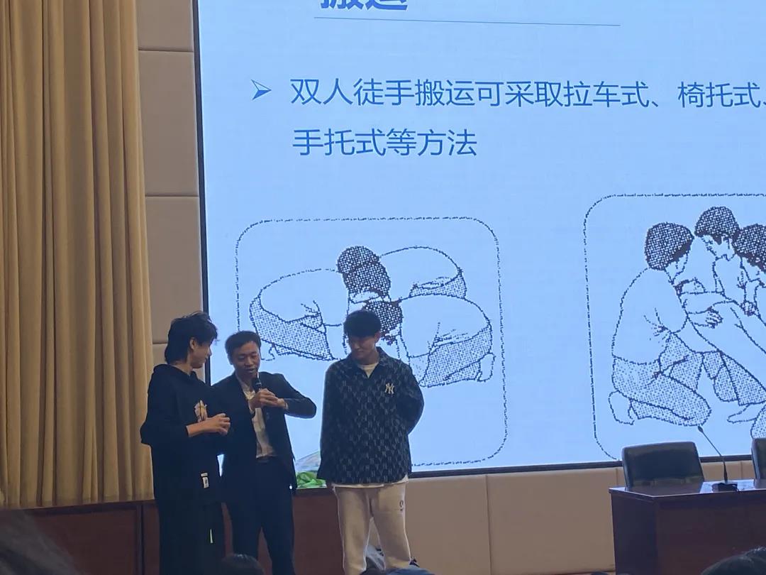讲座中,廖医生还对海姆利克急救法进行了详细讲解和演示,他通过讲解呼吸道梗阻的相关表现和不良后果,解释了海姆立克急救法的适应症状和基本原理。针对成人急救、孕妇急救、婴儿急救几种急救类型,普及了海姆利克法的实施流程和操作手法。同时,学生代表上台进行了现场演练。