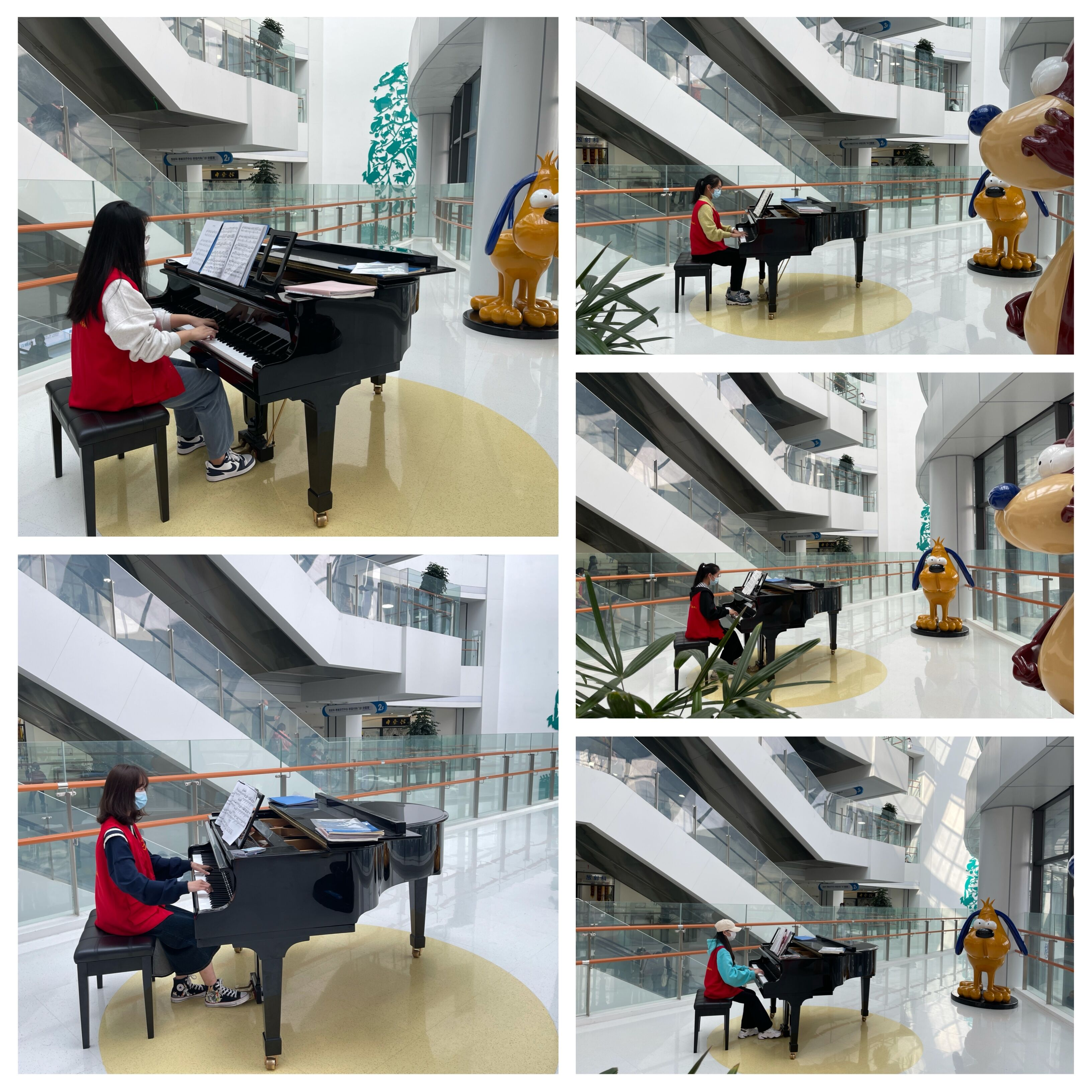 在儿童医院里,学生在门诊大厅进行钢琴弹奏,舒缓就诊病人的心情,为焦急的儿童家长送去抚慰与温暖。悠扬的钢琴声吸引了许多就诊的孩子和家长,他们纷纷驻足欣赏,很多人还拿起手机拍照录视频。一位家长说,“我都忘记是来看病的了,以为来听音乐会的!”医院的工作群里也有医生护士留言,“现场氛围太好了,感觉医患关系都融洽了。”