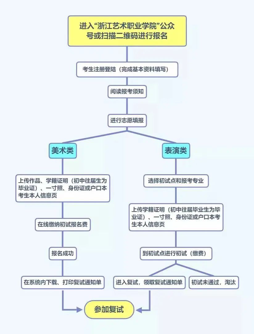 1、符合报考条件的考生,必须完成网上报名。关注“浙江艺术职业学院”微信公众号进入“招生就业”导航栏,点击“附中初试报名”或扫描下方二维码;