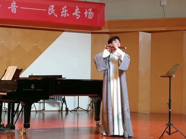 笛子独奏《婺江欢歌》由18小音乐班王涵演奏,作品以浙江婺江音乐为素材描绘了婺江两岸春意盎然的景色,体现了人们生活的美好和幸福。在演奏技巧上将循环换气和连续颤音结合使用,更丰富的表现了泛彩流金的滚滚江水和欢乐人群的动人场面。