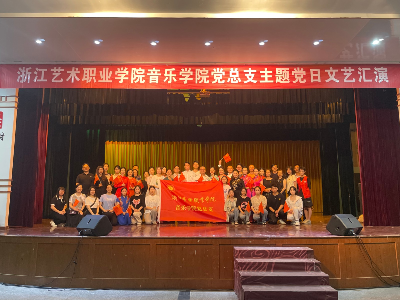 20声乐班学生党员闻人柯婷讲授微党课《我们为何唱红歌》,带着在场观众一起探寻唱响红歌的奥妙,一起在《没有共产党就没有新中国》的雄壮激昂旋律中祝福伟大的中国共产党、祝福伟大的祖国;小组唱《不忘初心》由杨韵、钱思舒、李猛三位教师演唱,深情的演唱再一次引导大家要牢记从何而来,为何出发,牢记人民群众的恩情,回报人民,回报养育祖国这片沃土;柳琴齐奏《春到沂河》由师生组合祝杭红、徐珂凡演奏,通过具有浓郁的山东风味的旋律,描绘了沂河两岸的优美风光,歌颂了幸福美好的生活;女声独唱《我们是荆门》由章蔓丽作曲、袁春演唱,作品温柔中蕴含坚强力量,唱出了浙江和荆门携手抗击疫情的深厚情谊和坚定信心;琵琶、古筝二重奏《春江花月夜》由夏金瓯、张凌演奏,委婉质朴的旋律,流畅多变的节奏,丝丝入扣的演奏,形象地描绘了月夜春江的迷人景色;独唱《初心清如水》是首次在舞台展示,这是学校清廉主题歌曲创作作品,由李猛演唱,旨在表达广大共产党员风清气正,廉洁为民的初心和使命;于善英教授满怀激情地朗诵配乐诗《西江月·井冈山》,再一次歌颂了井冈山将士坚守根据地的英勇斗争精神和诗人从容不迫、决胜千里之外的天才般的战略战术思想;古筝重奏《高山流水》由师生组合段廉、赵欣妮、张丽销演奏,乐曲或浑厚而优美,或细流涓涓、涛涛不绝,让人身临其境;女声独唱《南湖的风》也首次亮相舞台,歌曲是为庆祝中国共产党成立一百周年,由钱思舒创作并演唱。以南湖的风为象征,讴歌旧时革命的风推动红船向前,今日和煦的时代之风轻抚当代人的面庞和心灵,唤起人们的红色回忆,净化心灵,更好的传承中华优秀传统文化。