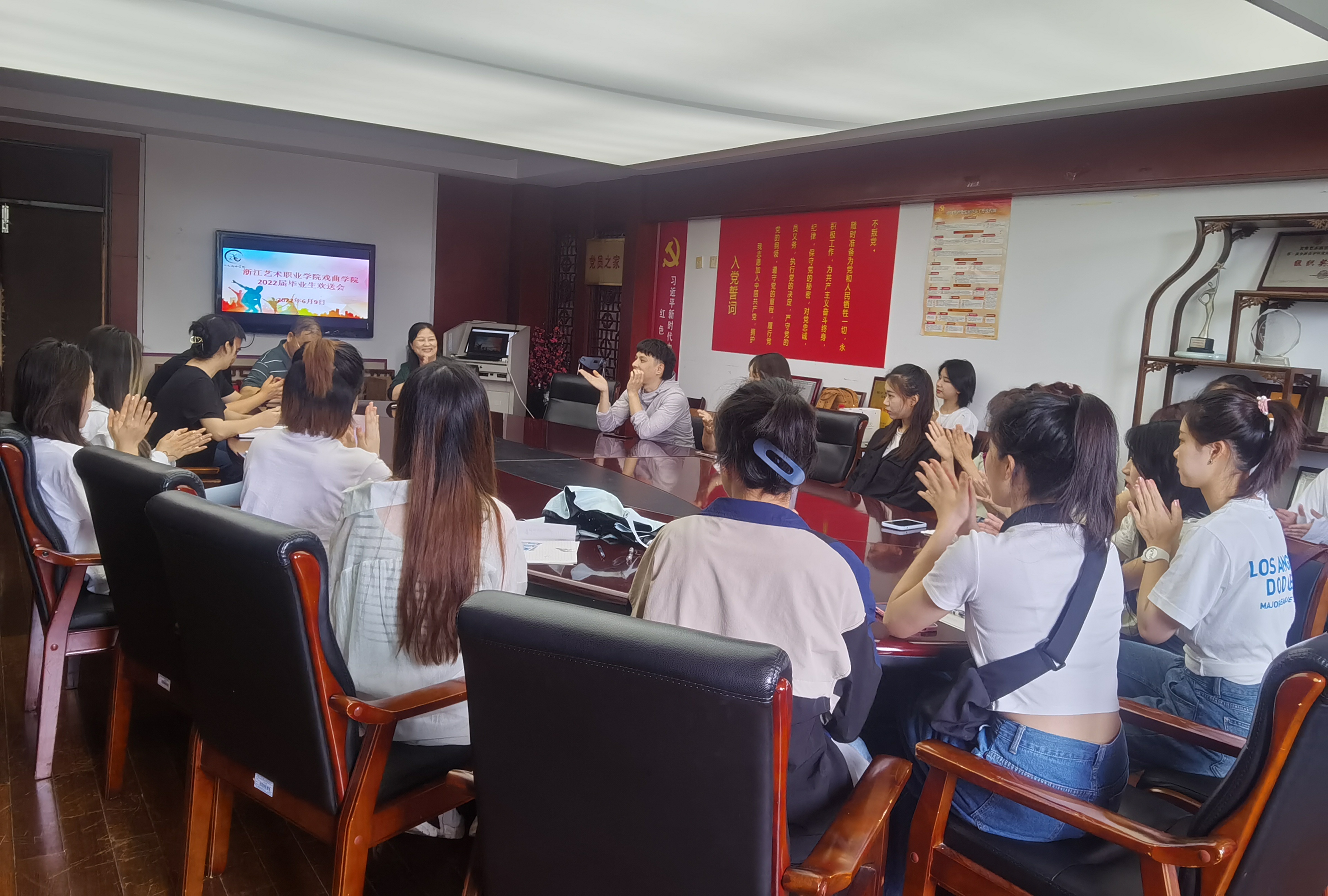 交流欢送会在三楼会议室举行。会上,戏曲学院党总支书记、副院长谢青真情致辞,对毕业生顺利完成学业表示热烈祝贺,与毕业生共同回忆昔日校园生活、社会实践的点滴,叮嘱勉励同学们努力通过自己所学、所践来实现自己的人生价值和梦想,坚守传统文化的传承与发展,把老师们的殷切希望和谆谆教诲化作今后不断前行的动力,衷心祝福同学们在未来的道路上脚踏实地、直面挑战,实现舞台梦想,书写人生最美的诗篇。