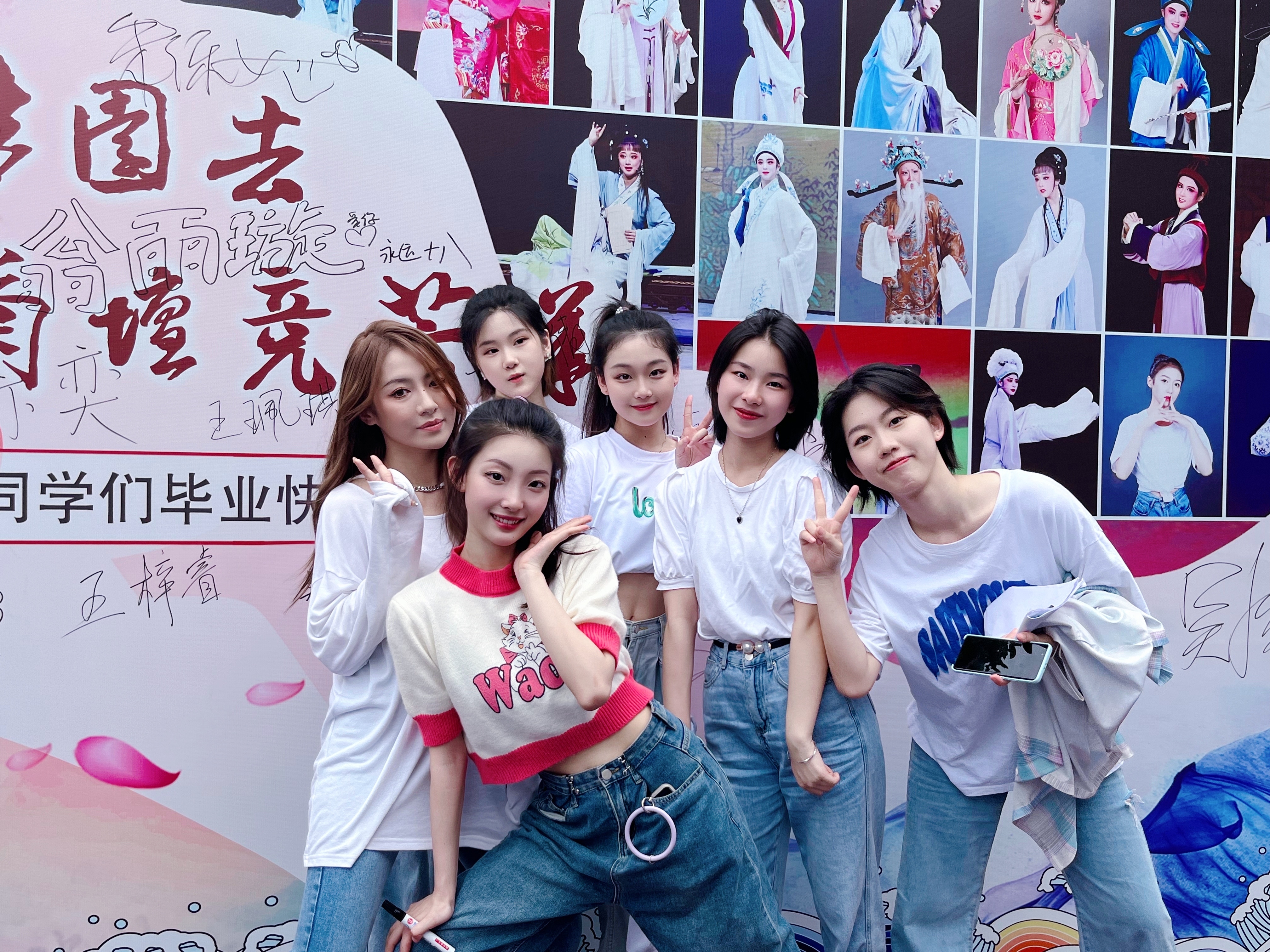 毕业生们来到戏曲学院毕业季喷绘墙前签名并留影。喷绘墙上一张张剧照透露着青春成长的过往,“今日桃李移园去,他年菊坛竞芳华”昭示着对未来的美好祝福。她们露出青春靓丽的笑容,拿起手中的画笔写下自己的名字,留下最美的笑容,成为校园最亮的青春风景线。