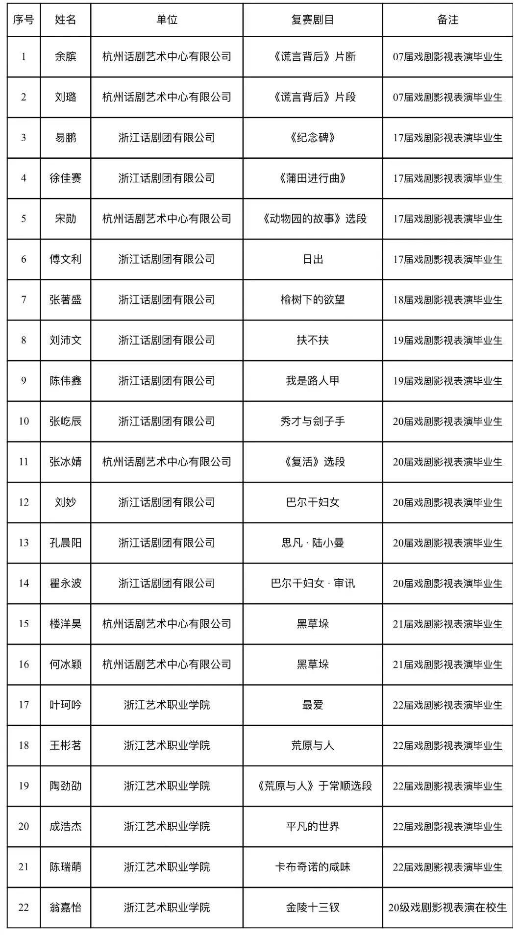 本次比赛共有277名参赛选手,经过专家评委评审,共有111名选手成功进入复赛,其中A组(专业组)69人,B组(非专业组)42人。6月11日,A组复赛火热进行,进入复赛选手中,浙艺戏剧影视表演专业学生22名,王皆慧、夏爽专任教师2名,助演校友更是不胜枚举……最终,王皆慧、夏爽、成浩杰、陶劲劭突破重围,成功闯入决赛。