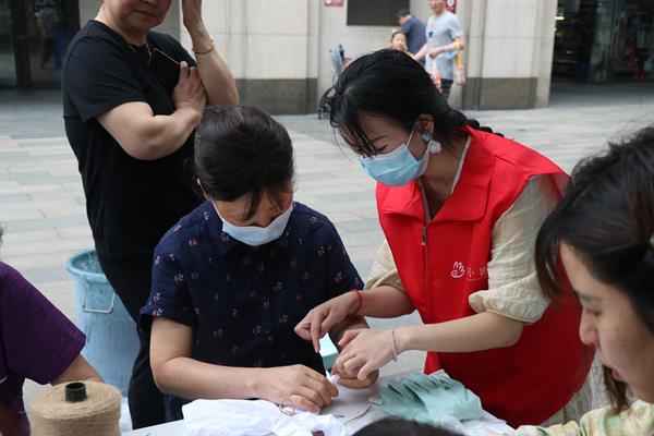 家住社区的王女士告诉艺小匠们,端午节儿女都在北京,特意预约端午的扎染活动,看着一群阳光的年轻人示范扎染,既能排忧解闷,还可以亲手体验扎染,心里实在是高兴。