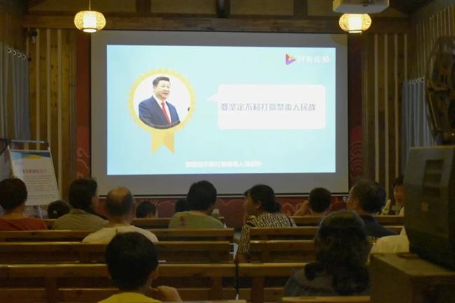 在大墅村文化大礼堂和枫树岭镇下姜红影剧院,服务队精选了由我校出品的影片《妈妈们的青春往事》进行放映,为小镇居民重现了上世纪40年代末至90年代中期军人的生动面貌。在电影放映之前开展了禁毒、反邪教宣传活动,队员们向村民分发禁毒、反邪教宣传资料,讲解知识,强化村民们的禁毒、反邪教意识。