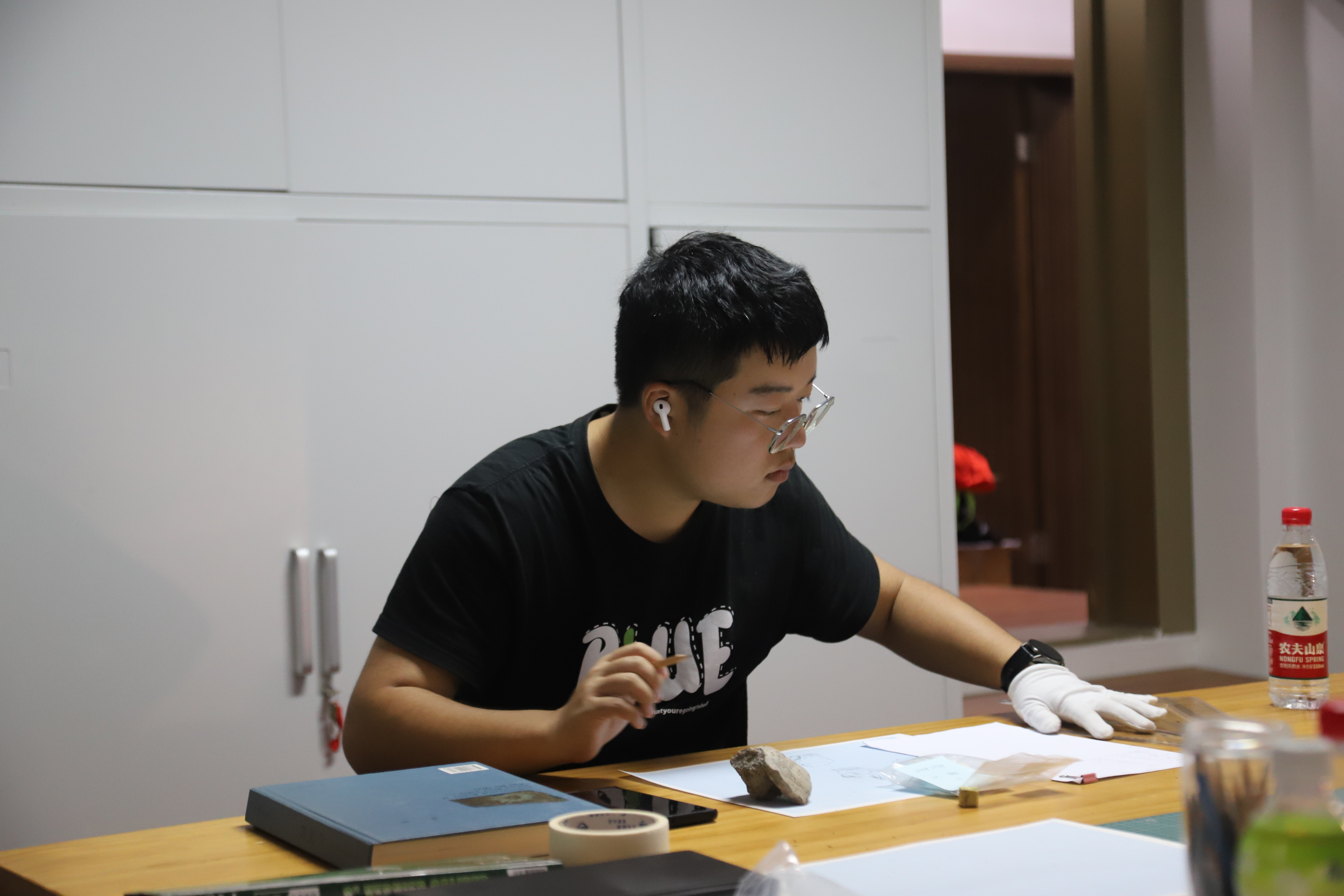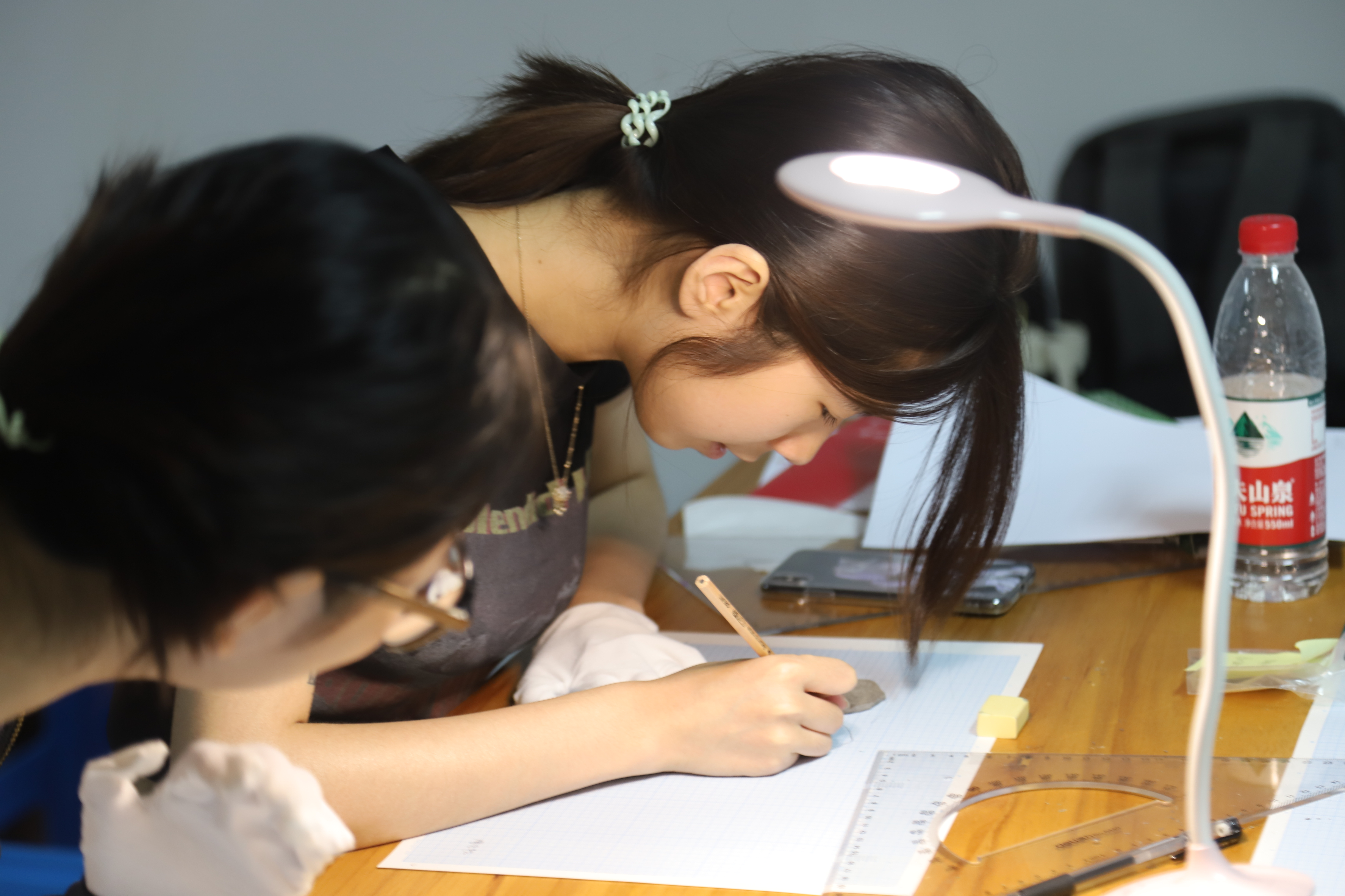 团队成员共计9人,分成绘图组和摄影组,大家各司其职、通力合作。绘图组组员使用测量工具精准测量文物尺寸并手绘记录,由于每样文物的形制、出土状态和材质的不同,在记录过程中运用不同的处理方式,每一件文物都需要团队成员集中精力有序协作完成。