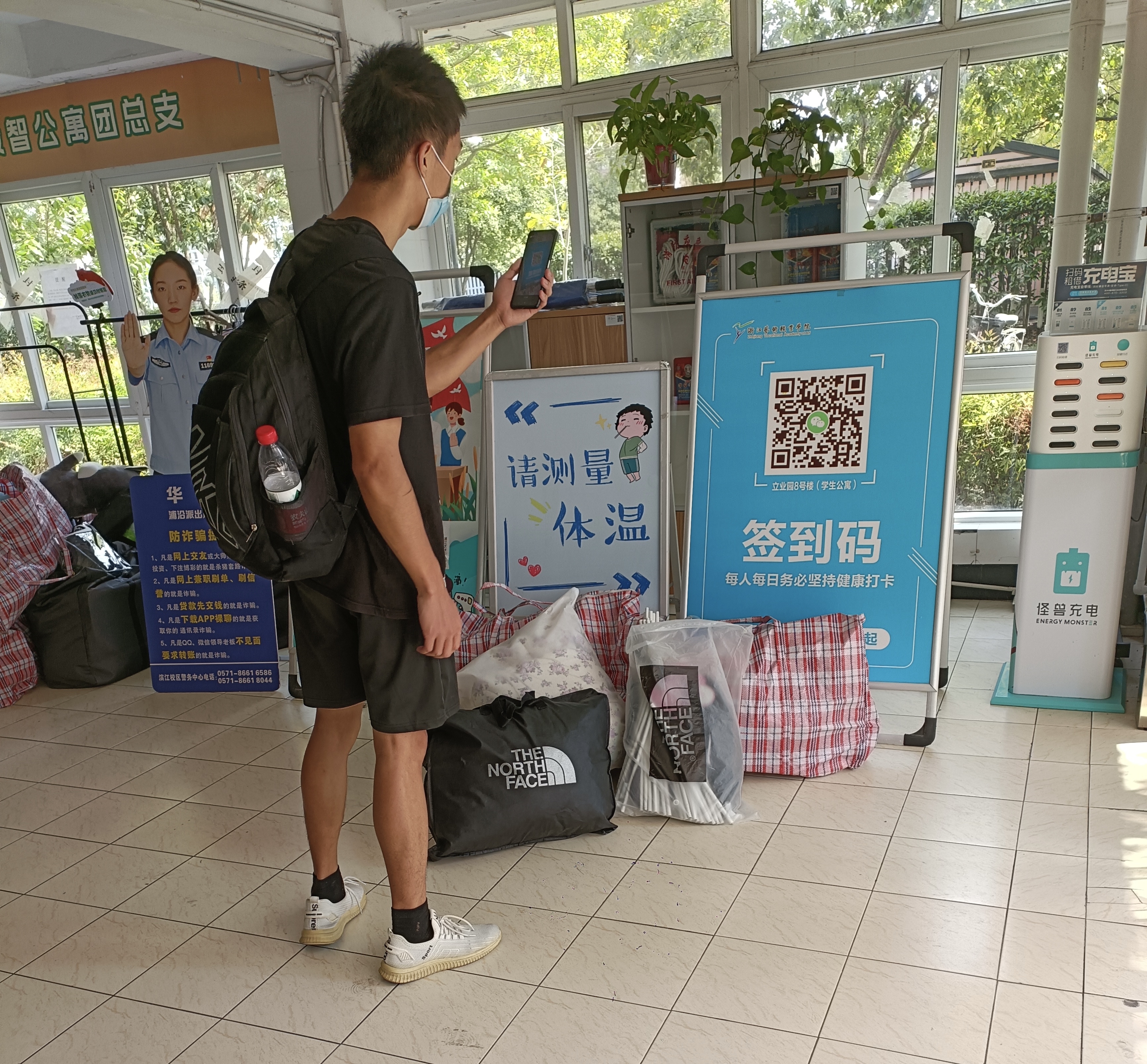 9月12日和13日,我院学生在公寓门口有序扫码报到。