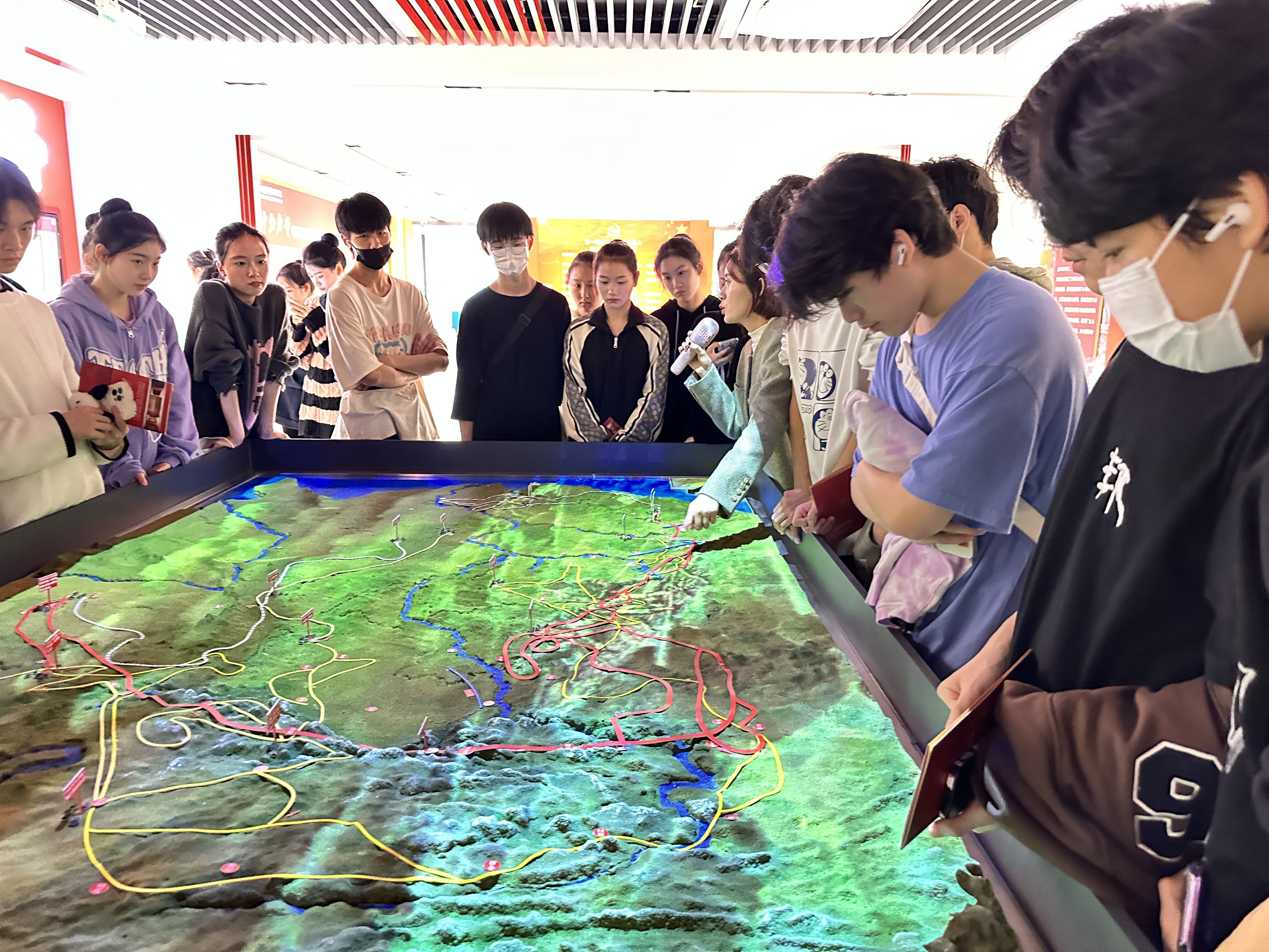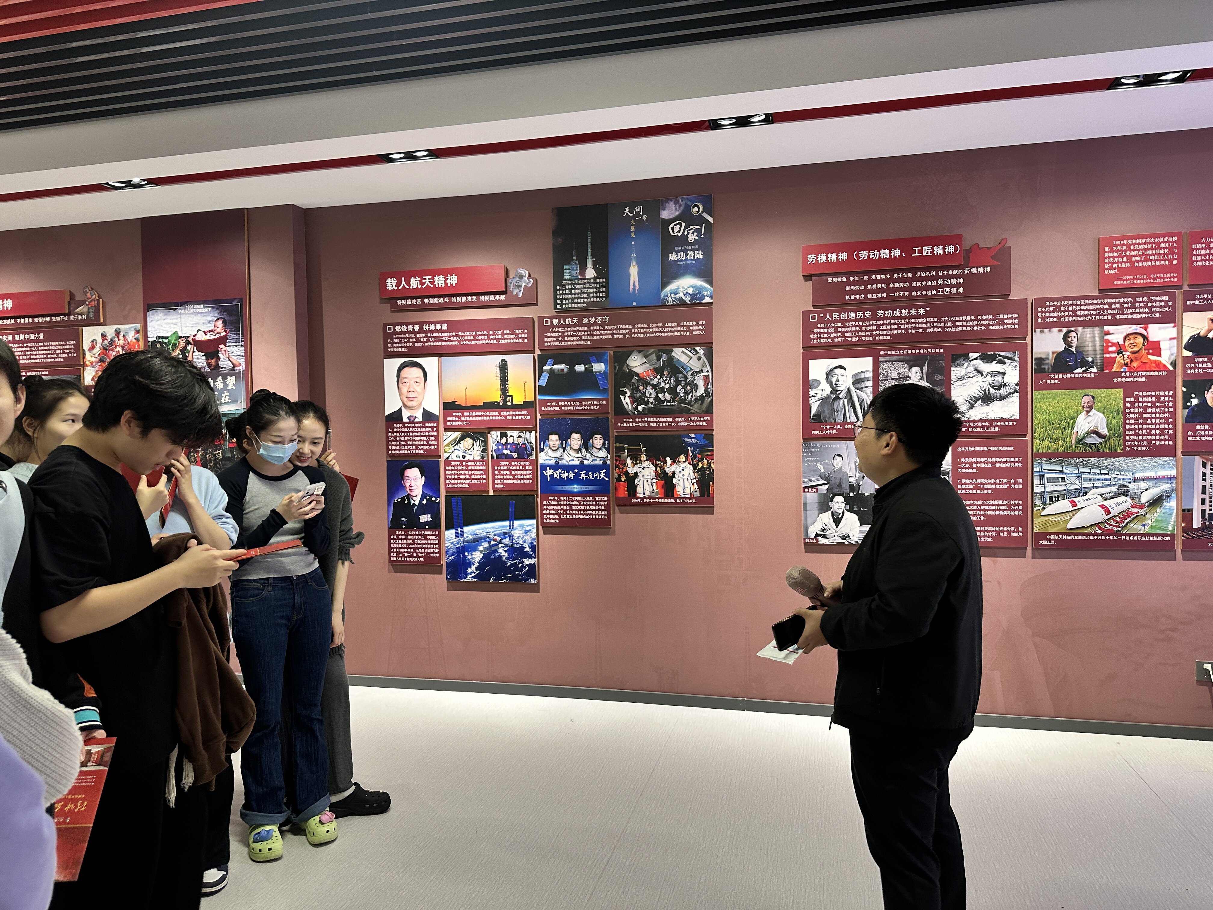 在实践教学中,浙江商业职业技术学院马克思主义学院教师唐梓琳老师结合展馆内容,声情并茂的为同学们讲解了伟大建党精神、红船精神、延安精神等一些列中国共产党人的精神谱系,同学们饶有兴致的围着红军长征路线电子沙盘,听老师讲解长征精神。陈涛老师为同学现场讲解了航天精神、脱贫攻坚精神,展示了新时代建设成就,带领学生深刻领悟“马克思主义为什么行,中国共产党为什么能、中国特色社会主义为什么好”的真谛。在整个实践教学过程中,同学们听得认真,看到仔细,课后纷纷表示,相比起课堂上传统的授课方式,我更喜欢这样的思政课,这让我更感性和更有参与感。