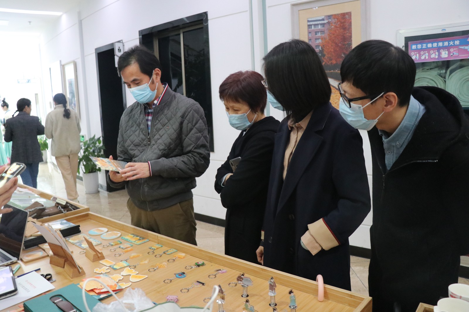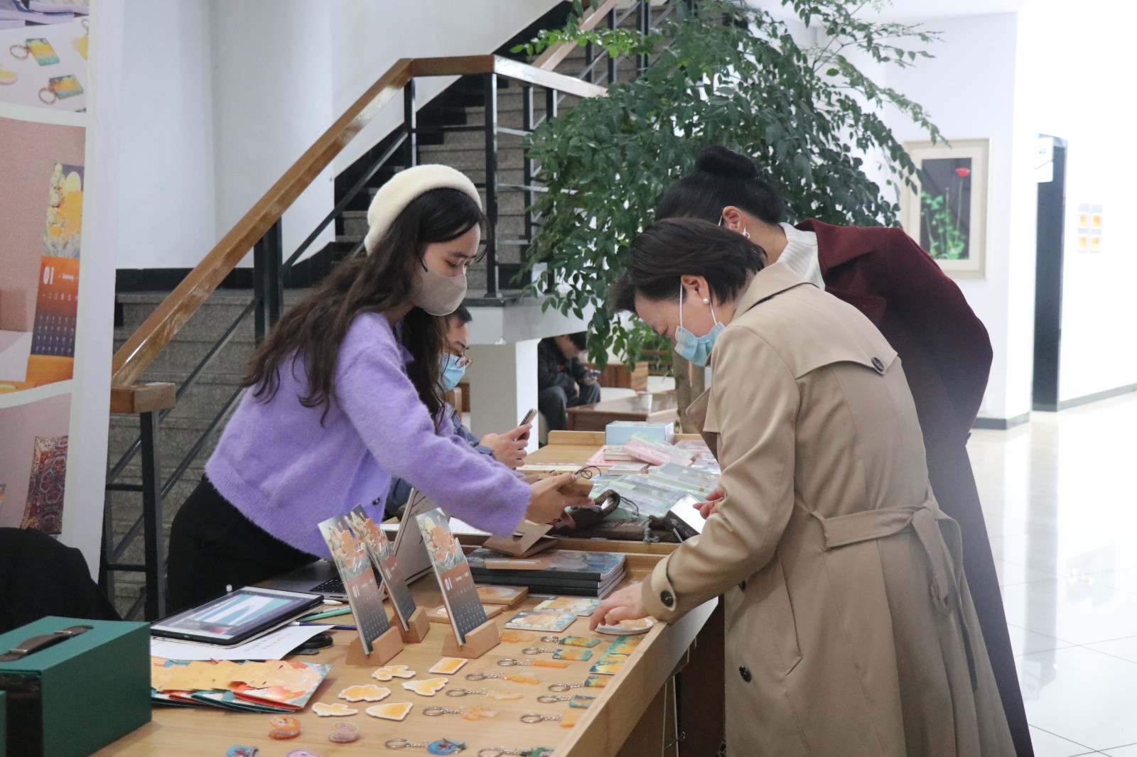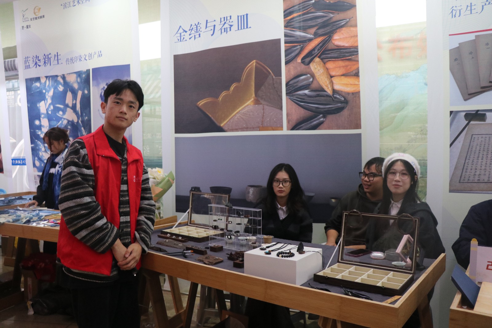 “传统书画装裱古籍修复”的摊位上,同学们可以了解到不同种类的古籍装帧类型,并体验线装本活动,深入感受文物修复的魅力。“金缮与器皿”摊位琳琅满目,以火枪加热银条而铸造的银戒,打磨檀木后镶嵌上琉璃的项链,上大漆推光后制成的落叶器皿,文物修复与保护专业的同学们让非遗传统技艺在文创产品中焕发出新的生机。