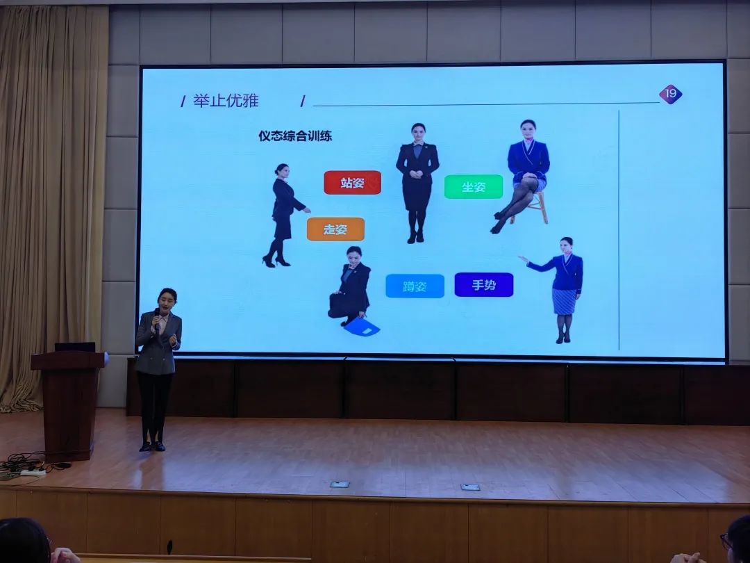 张佳以礼仪的历史起源和礼仪的核心概念为切入点,从着仪容仪表、服饰着装、举止行为等方面详细介绍了文明礼仪的具体内容和要求,引导同学们认识到文明礼仪与遵守礼仪行为规范的重要性,呼吁同学们做懂礼仪、讲礼仪、行礼仪的新时代青年。同时,她还详细讲解了文明礼仪中的交往举止、穿戴服饰等细节知识,并对坐、站、蹲、手势等姿势体态作了具体的演示。